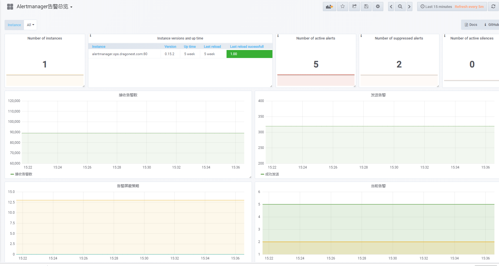 Dashboard showing Prometheus Alertmanager metrics for observing status of the cluster and possible debbuging. AlertManager告警总览