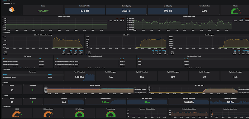 EdgeFS designated management server (aggregator) exposing post-filtered metrics in format compatible with Prometheus "pull" model. It listens on port 8881 by default. To verify if metrics works, run the following command on aggregator node (or use proper IP address in case of Docker / K8s deployment): curl localhost:8881/metrics Prometheus service periodically scrapes this URL and pulls statistics into its own time series database. Grafana dashboard configured with Prometheus data source and displays metrics in a nice presentable way.