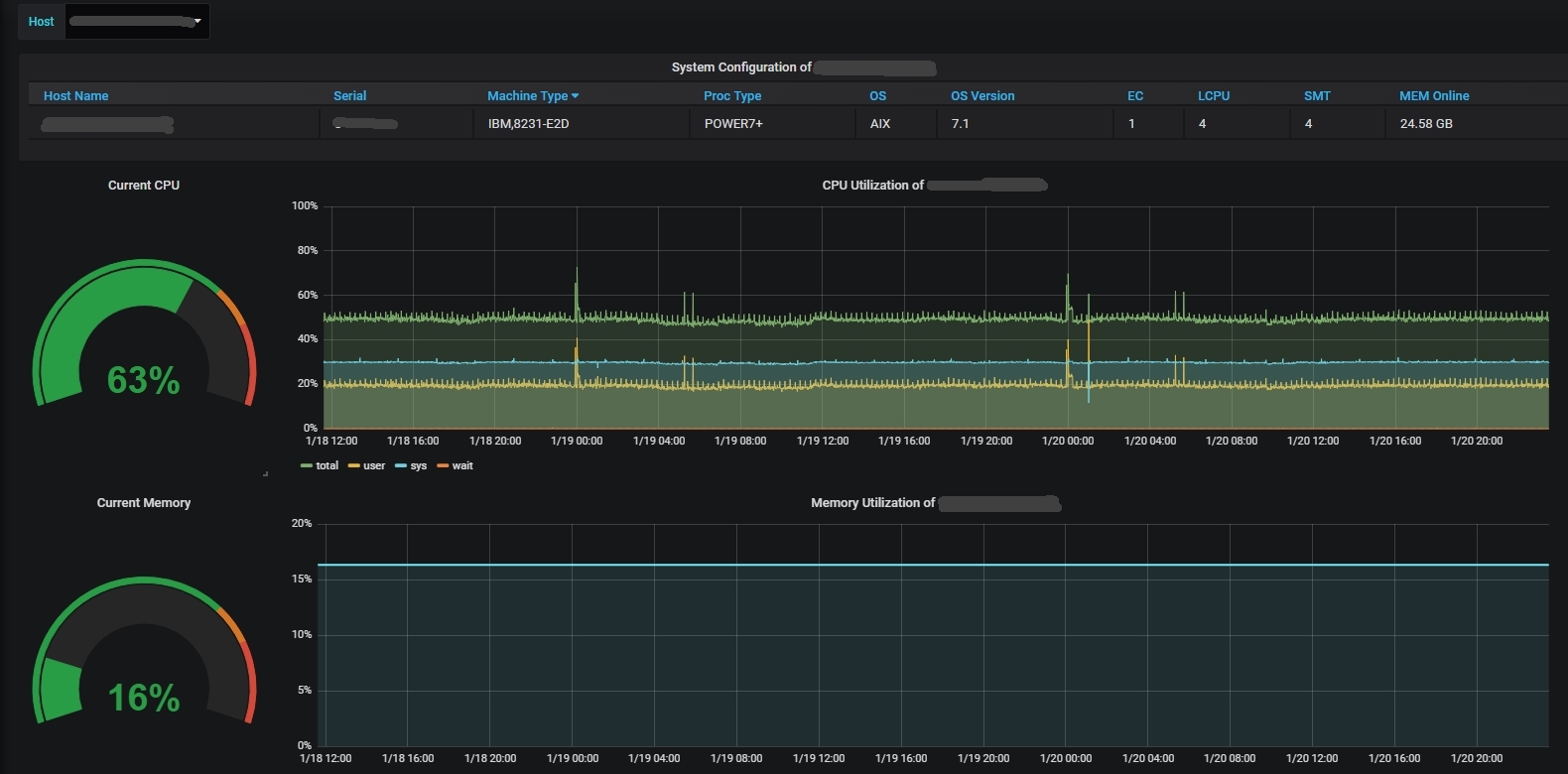 Performance stats of individual server with drop down menu from influxdb source and njmon input. Comments, corrections and suggestions welcome