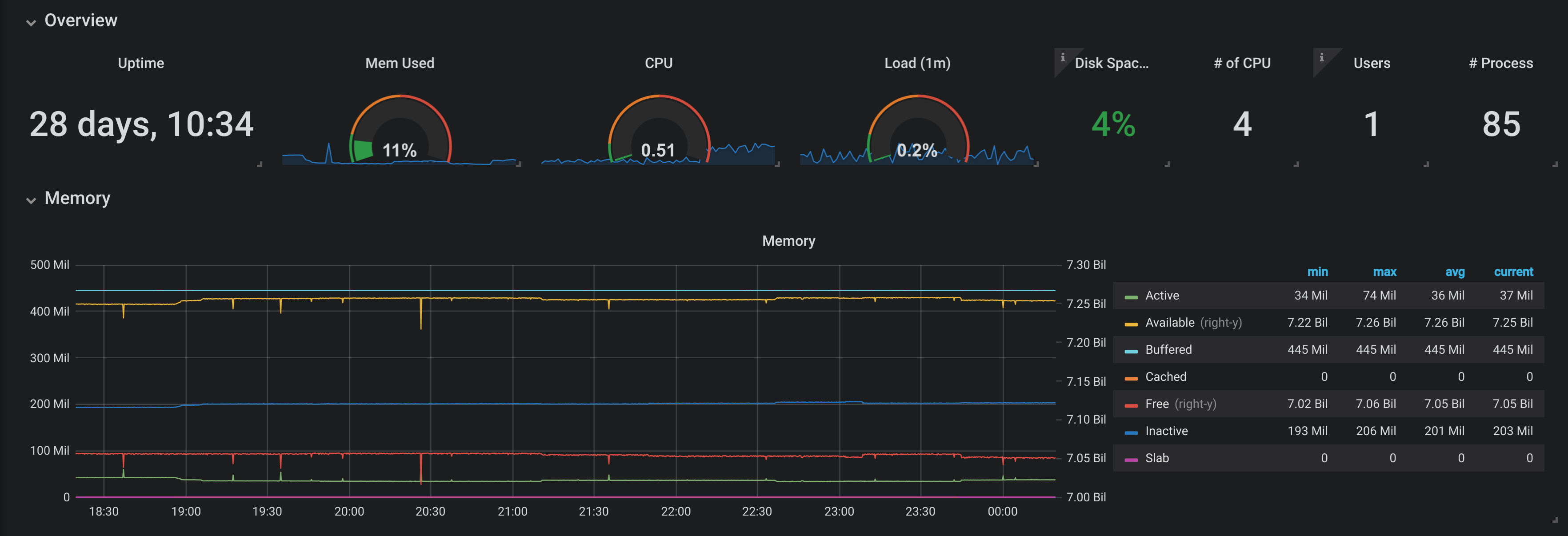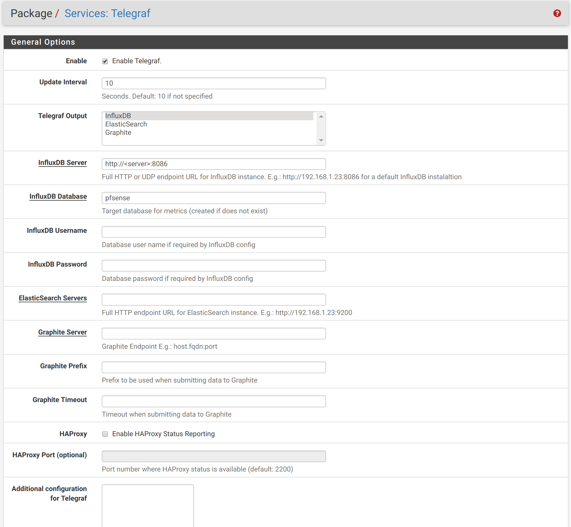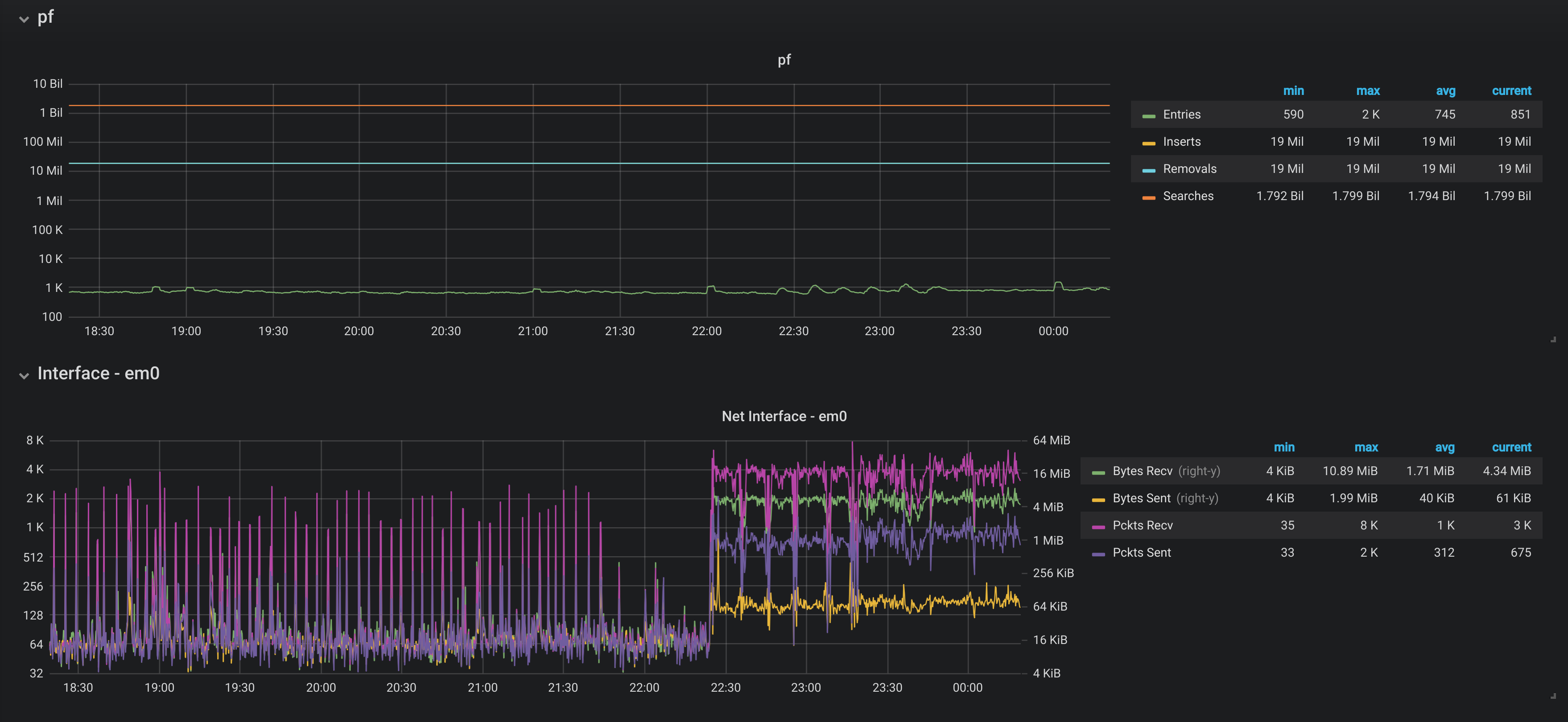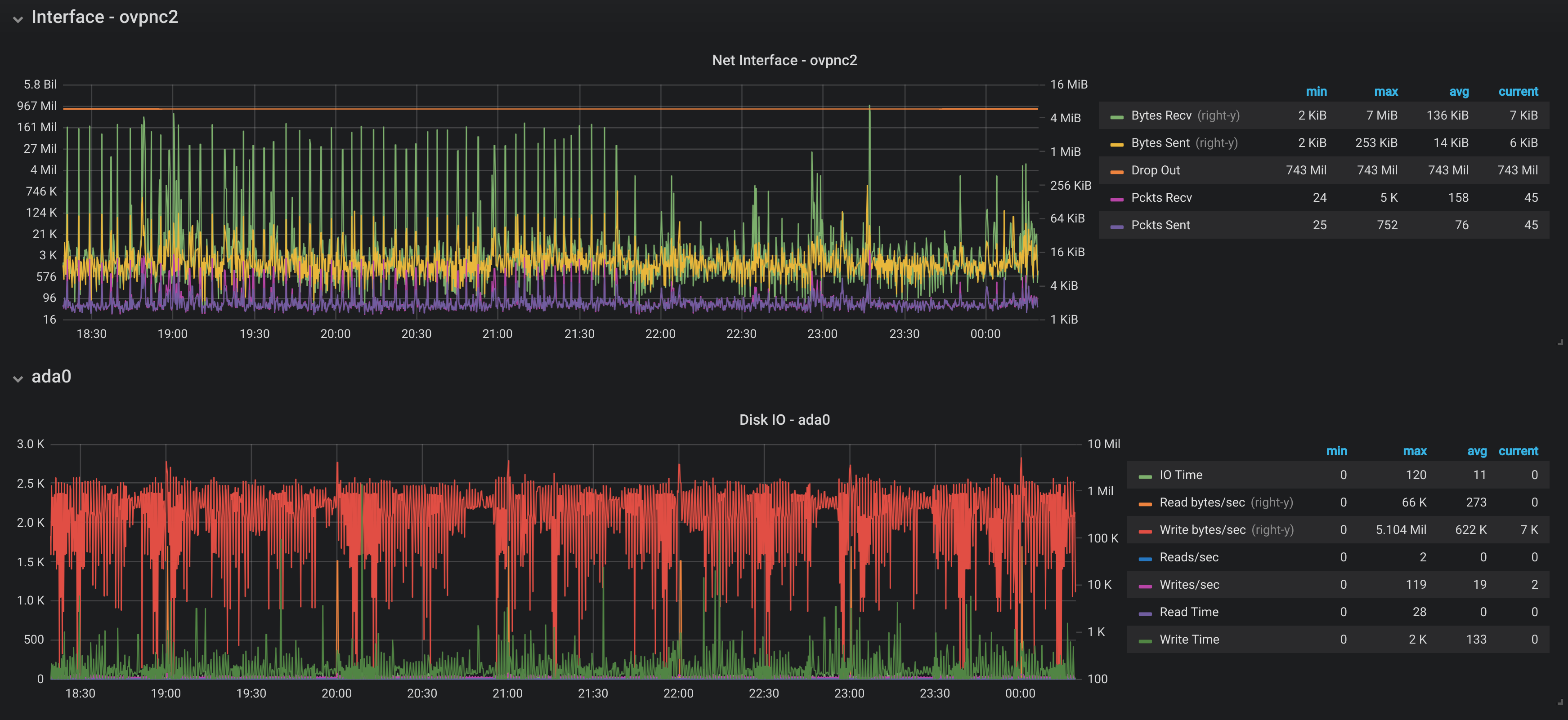 Showing metrics from pfSense firewall collected using Telegraf package. It should work with multiple hosts/pfSenses and you can select with interfaces and disk (IO) to show.