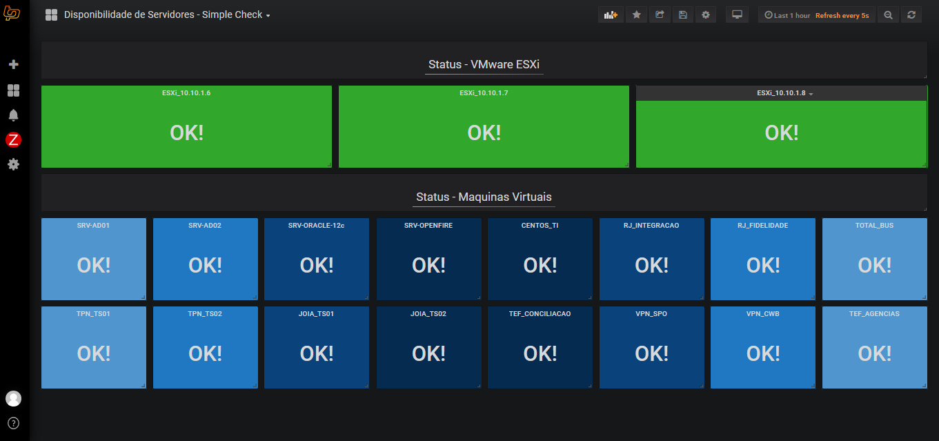 The Disponibilidade de Servidores - Simple Check dashboard uses the alexanderzobnin-zabbix-datasource data source to create a Grafana dashboard with the singlestat and text panels.