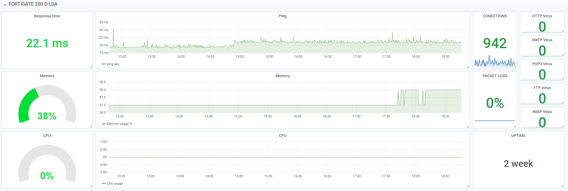 The FORTIGATE dashboard uses the alexanderzobnin-zabbix-datasource data source to create a Grafana dashboard with the graph and singlestat panels.