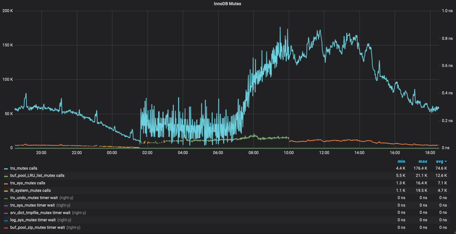 InnoDB Mutex graph made for PMM (Percona) Using custom queries. Instructions available at https://www.percona.com/blog/2019/03/12/pmms-custom-queries-in-action-adding-a-graph-for-innodb-mutex-waits/