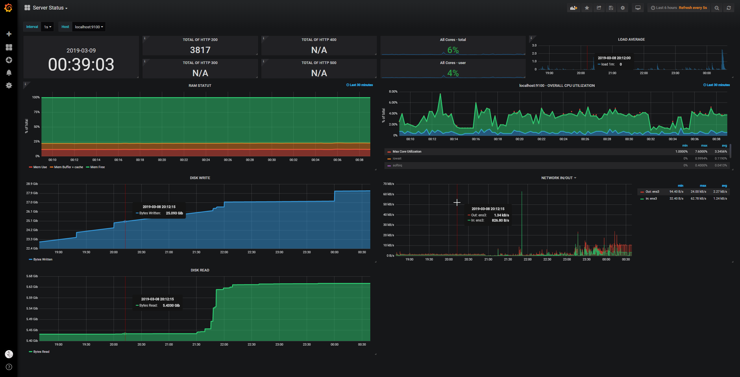 PROMETHEUS DASHBOARD Include : http 200; 300; 400; 500 cpu usage and overall cpu utilization filter (clik + ctrl for multiple select) load average disk write/read network in/out host choice interval choice flat color ! and some informations in the top left corner of certain graph