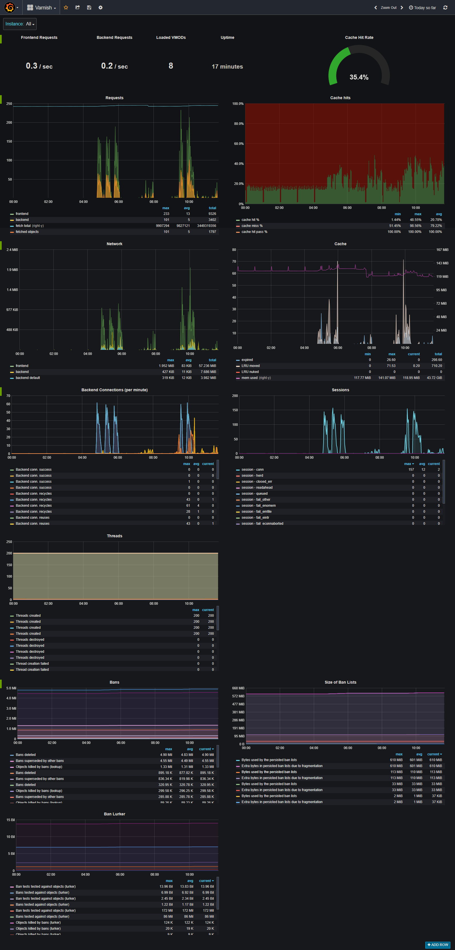 A dashboard to use to debug a running varnish instance. Easily track requests, cache hits, network i/o, sessions, threads, bans, ban lurker and the ban list size.