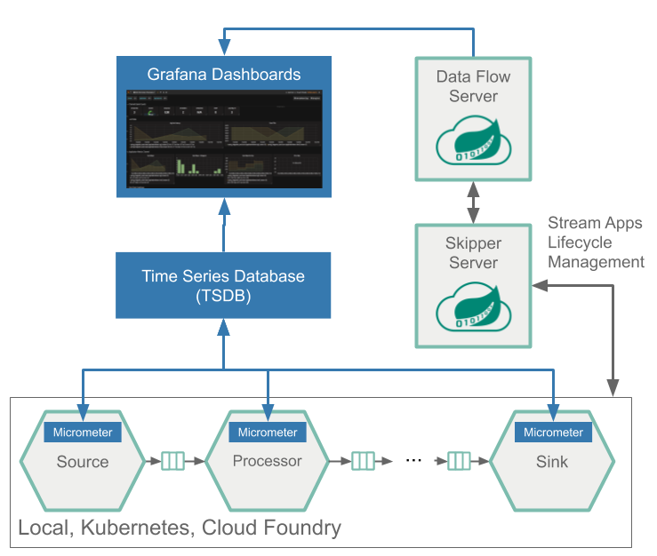 Monitoring with Spring Cloud Data Flow: https://dataflow.spring.io/docs/concepts/monitoring/