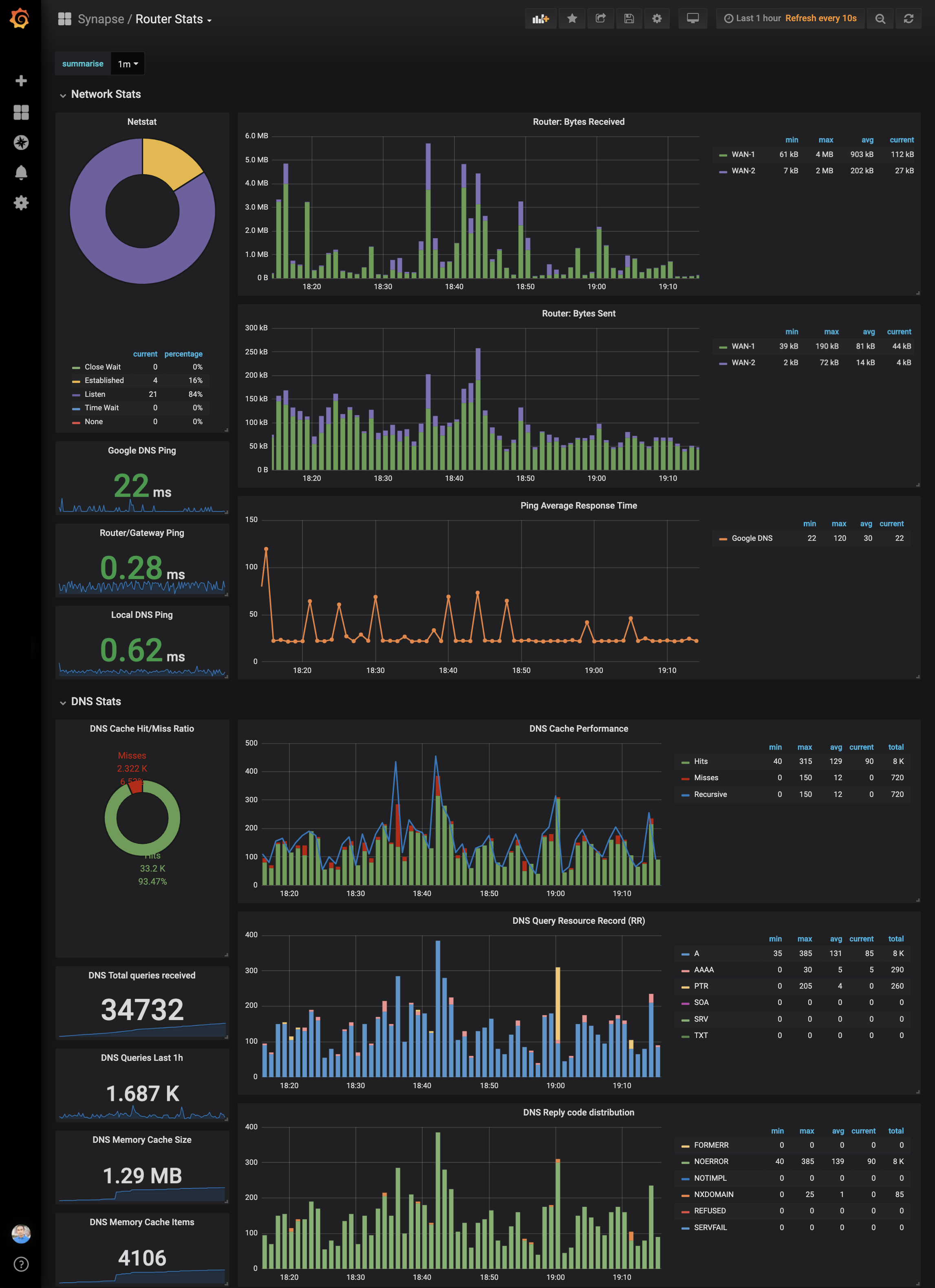 For the DNS stats, I'm using the unbound plugin for telegraf.