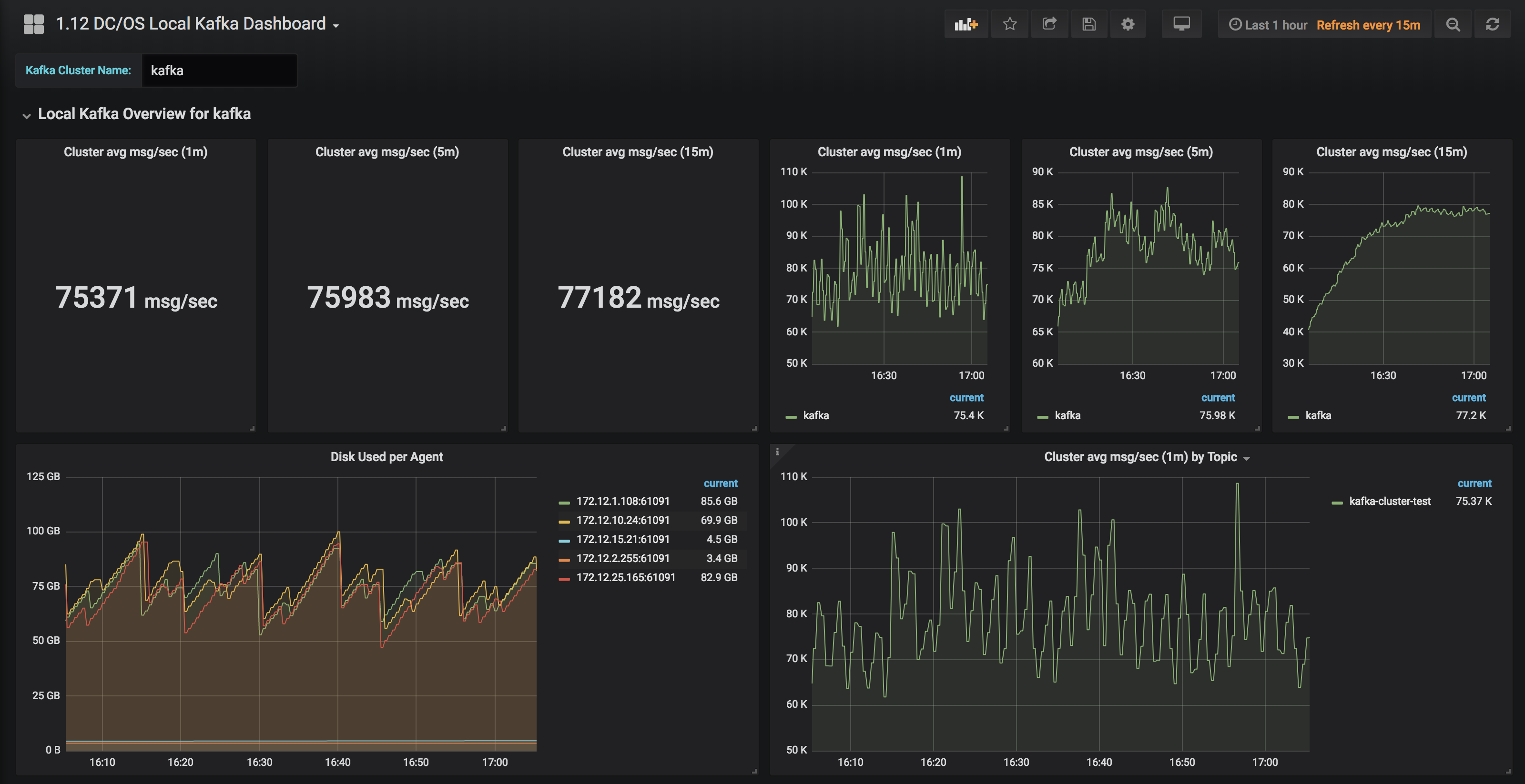 Example of a Selectable Local Kafka Dashboard for DC/OS 1.12 - For Developers: Parameterized to an input-able Kafka Cluster Name - Only displays metrics for Brokers and Topics within a specified Kafka cluster