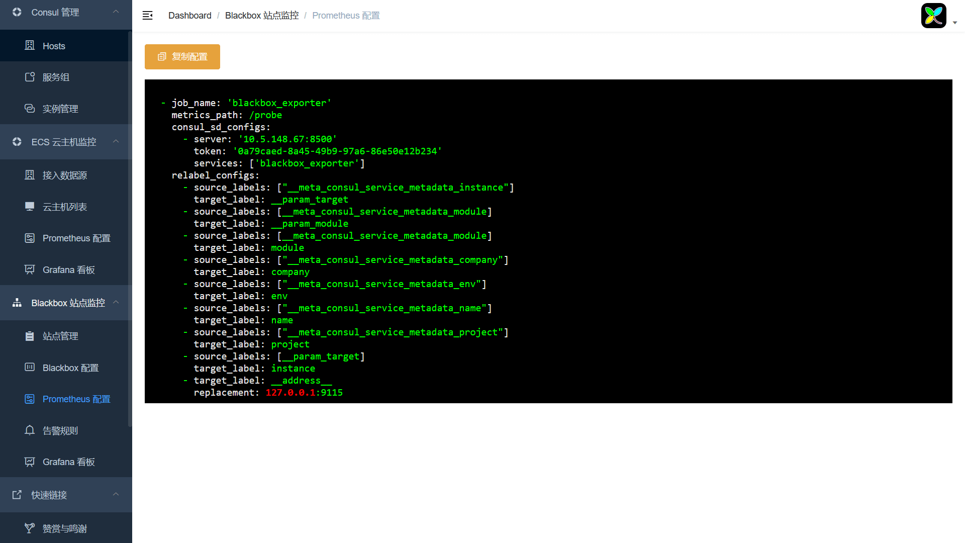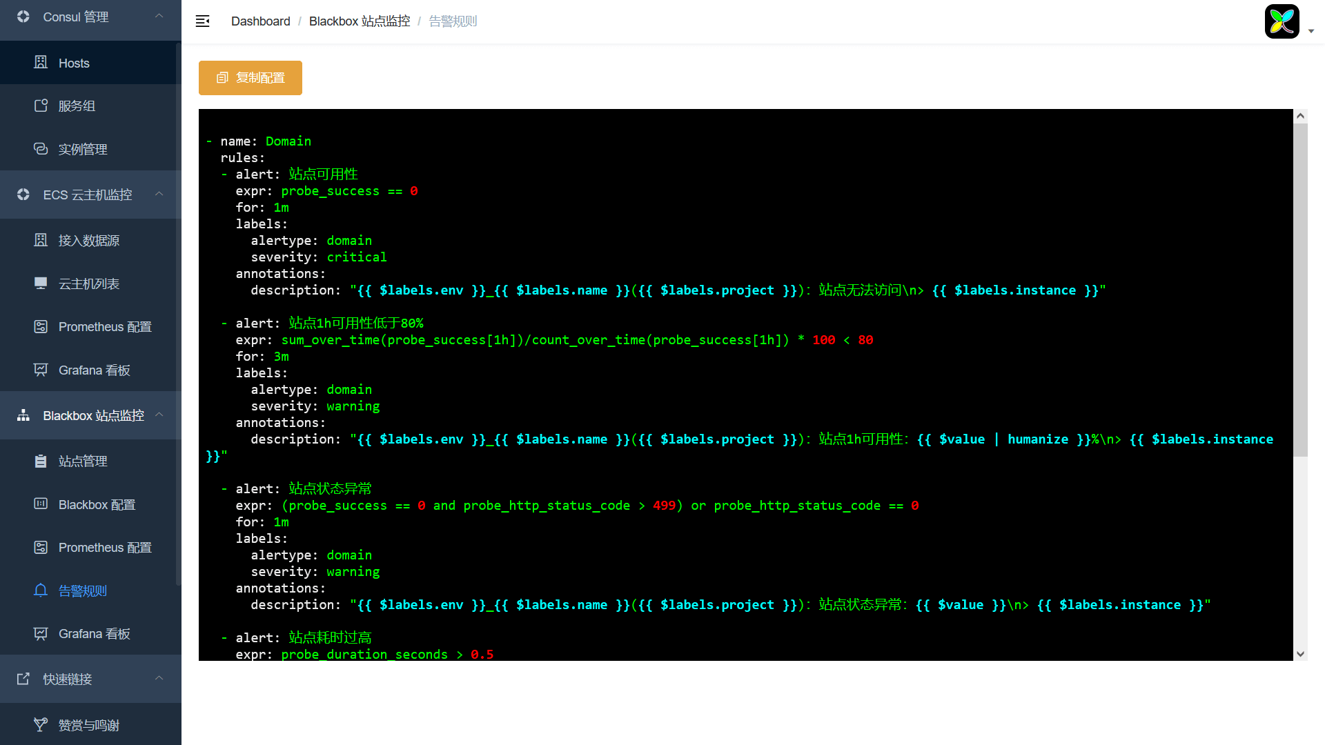 - 提供了Blackbox的配置,Prometheus的配置以及Prometheus站点监控的告警规则。