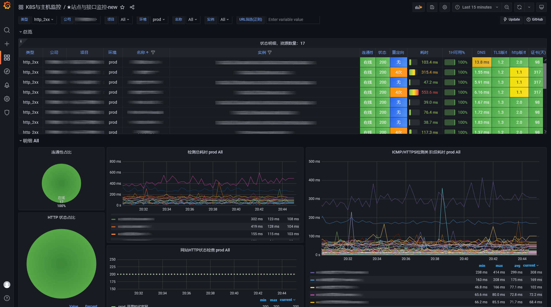 支持Grafana 8,基于blackbox_exporter 0.19.0设计;采用图表+曲线图方式展示TCP,ICMP,HTTPS的服务状态,各阶段请求延时,HTTPS证书信息等;优化展示效果,支持监控目标的分组、分类级联展示,多服务同时对比展示。