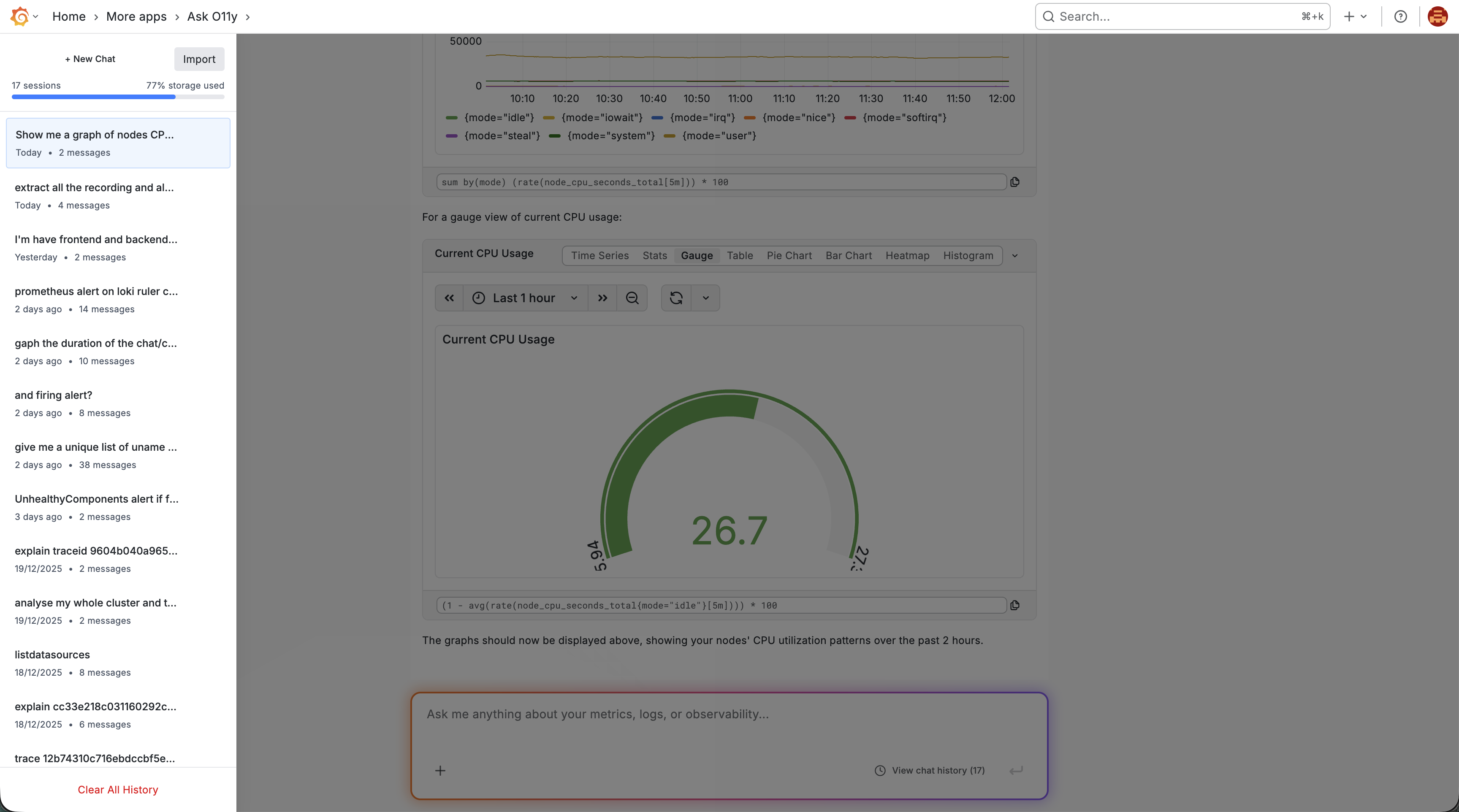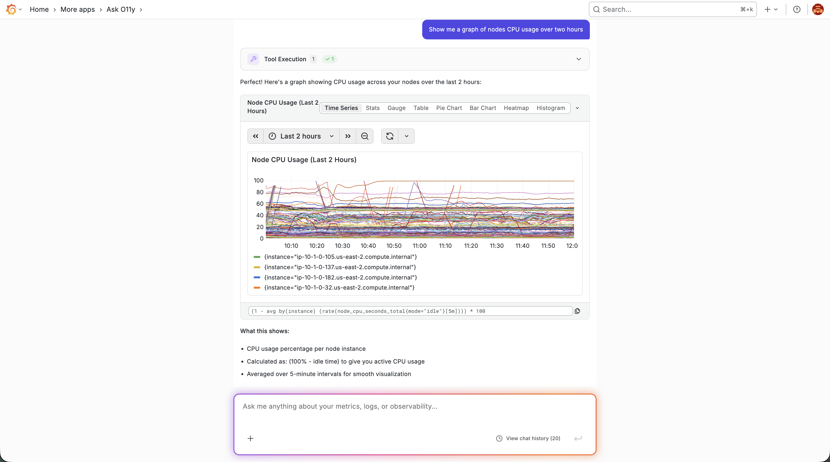 - Ask a question: "Show me CPU usage in the last hour"