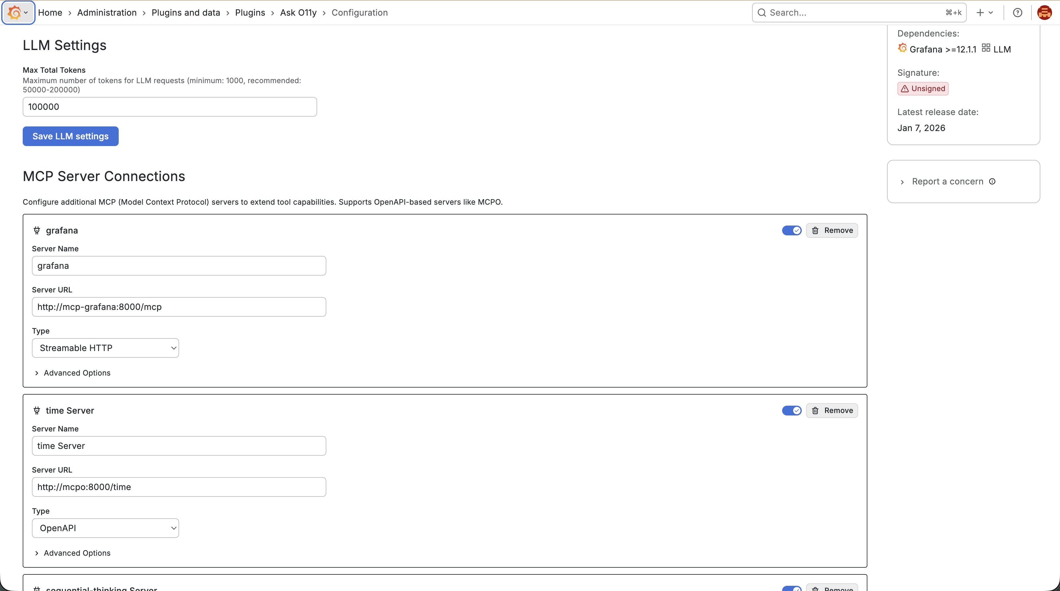 - Go to Configuration → Plugins → Ask O11y → Configuration