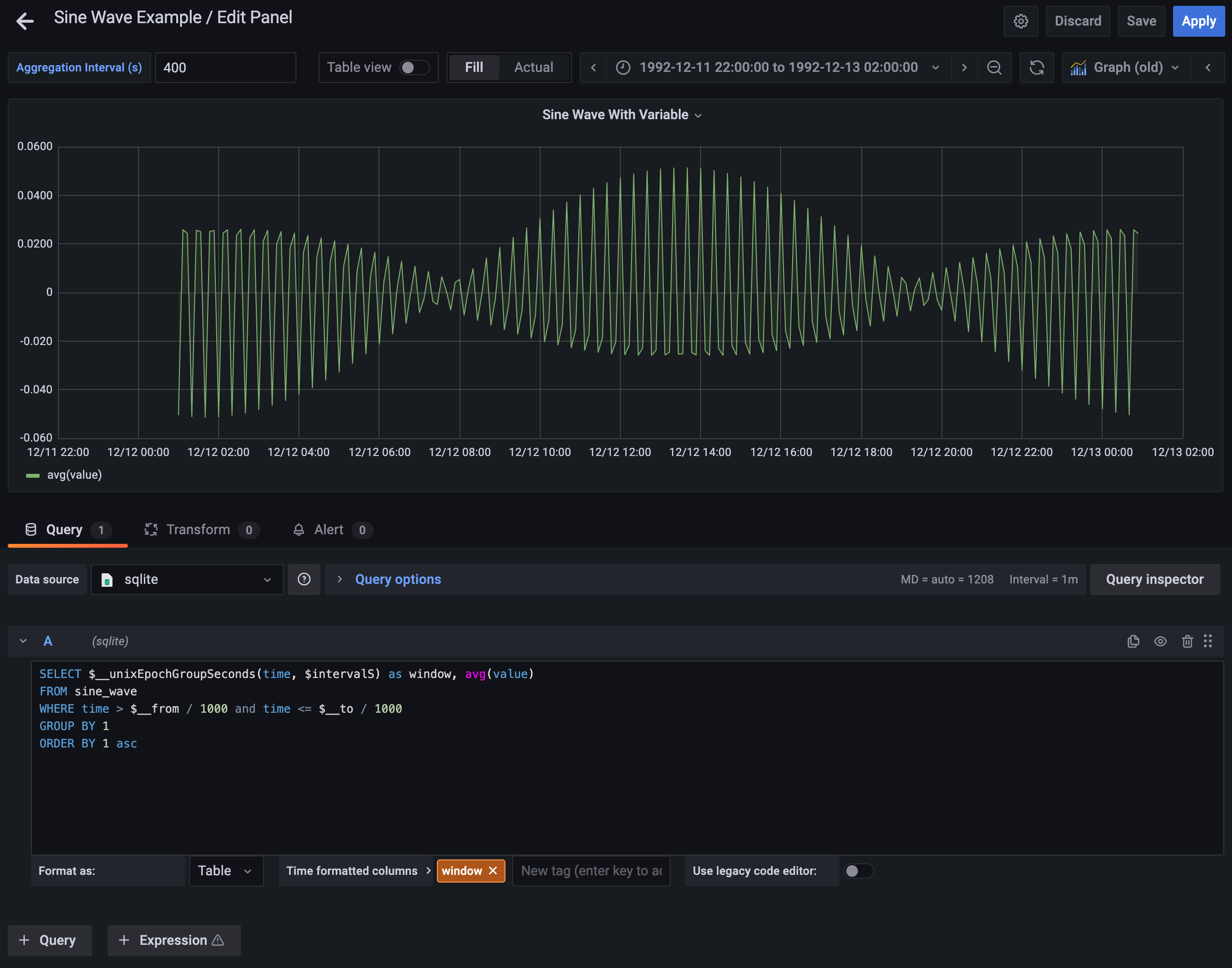 SQLite has no native "time" format. It relies on strings and numbers for time and dates. Since especially for time series Grafana expects an actual time type, however, the plugin provides a way to infer a real timestamp. This can be set in the query editor by providing the name of the column, which should be reformatted to a timestamp.