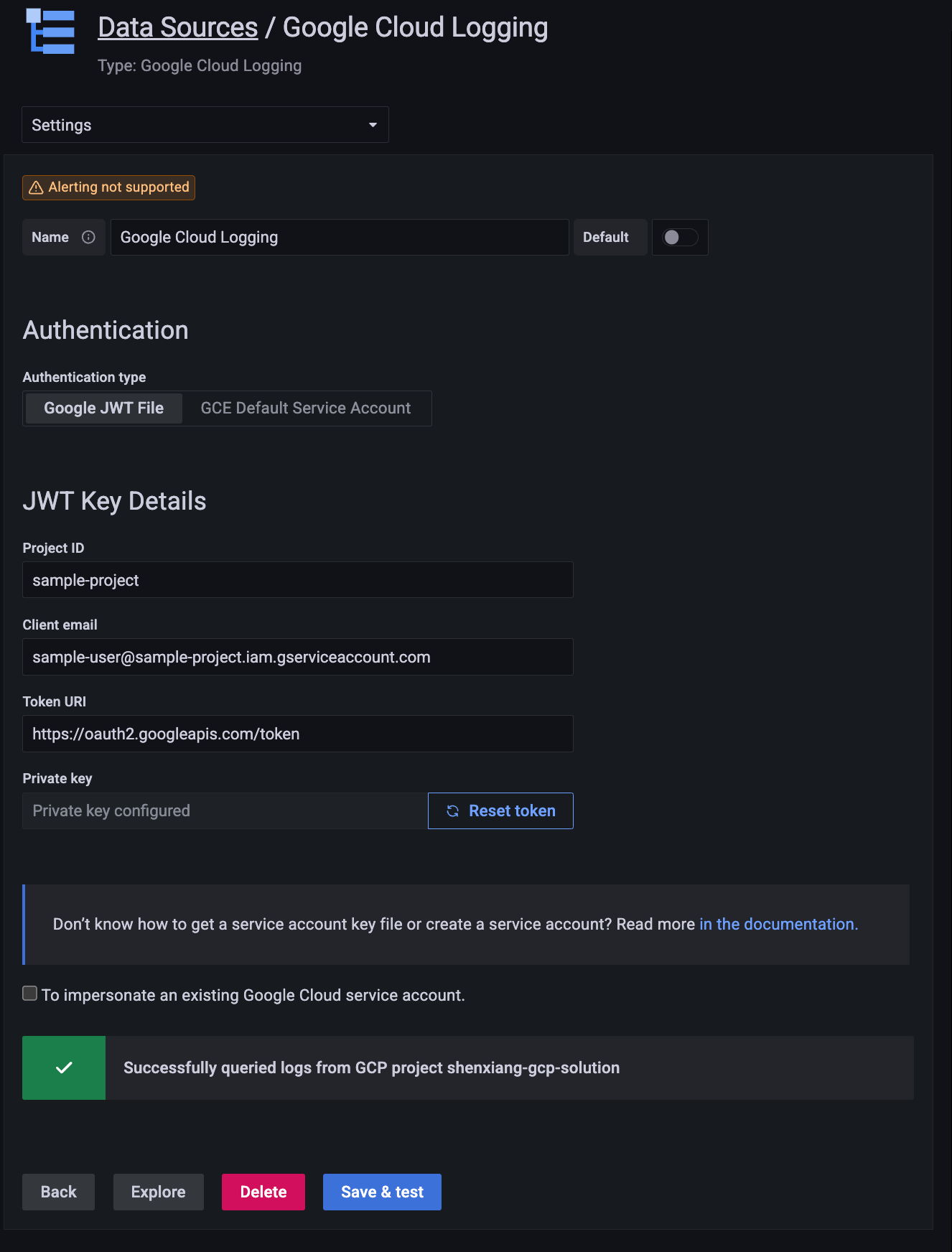 - Click "Save & test" to test that logs can be queried from Cloud Logging