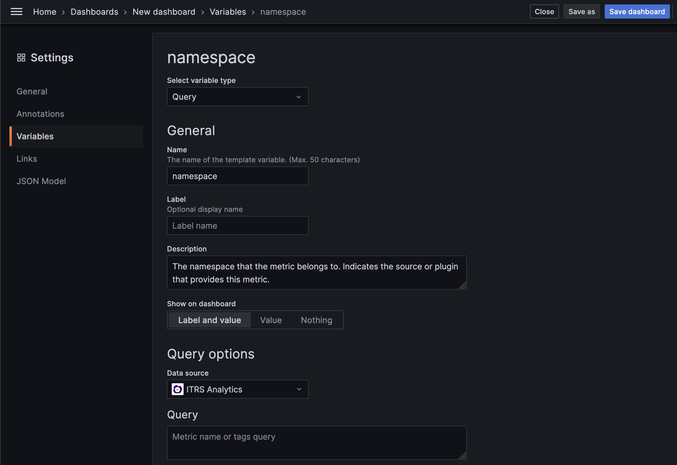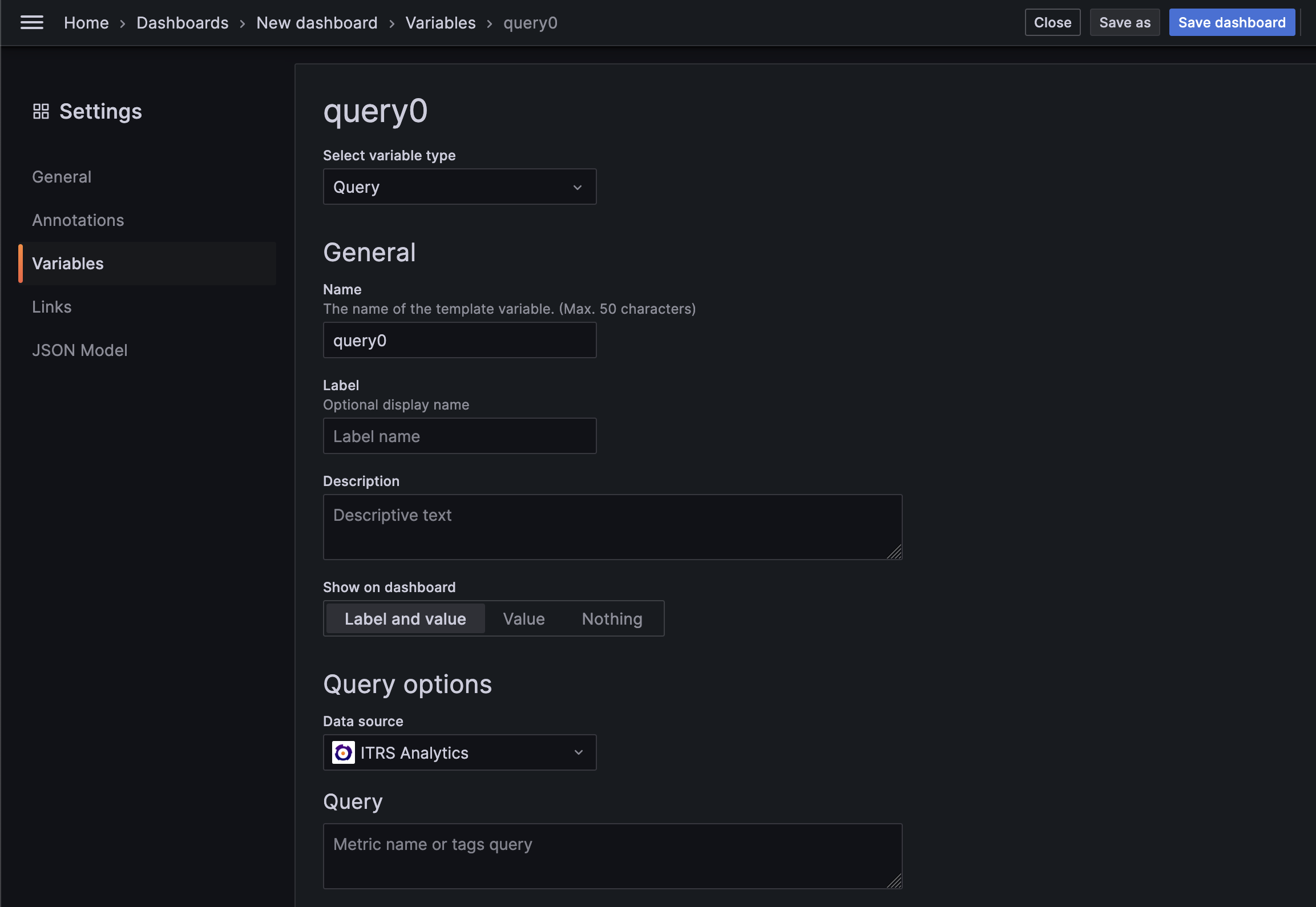 You can add variables to your dashboard. To add a new ITRS Analytics query variable, go to dashboards settings, and click on Add variable in Variables section.