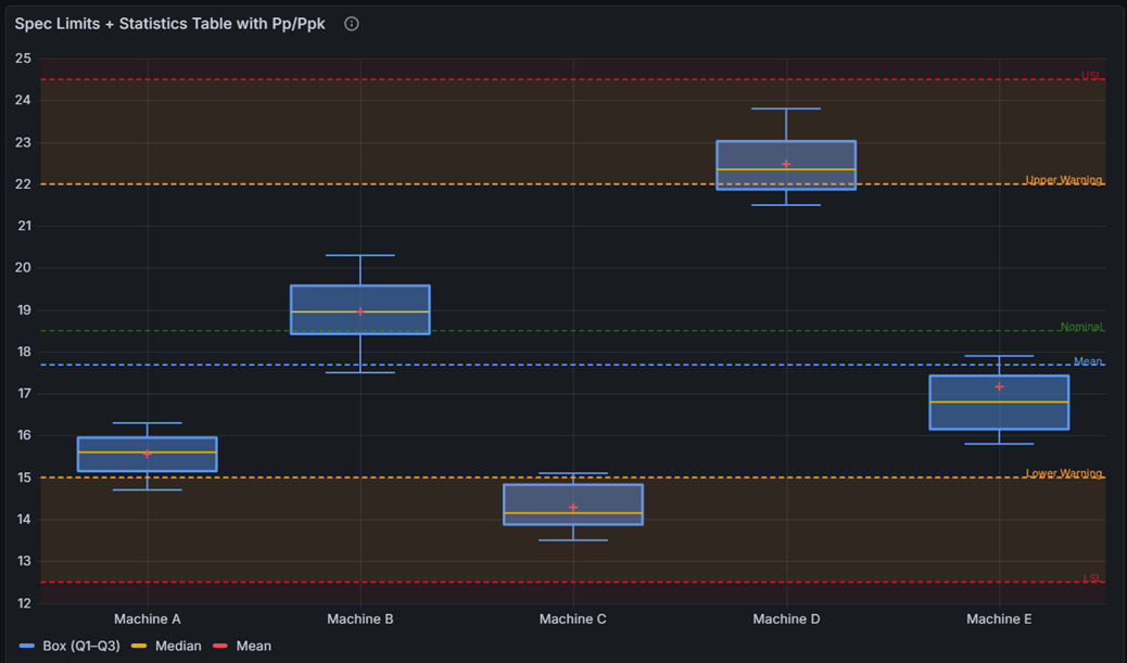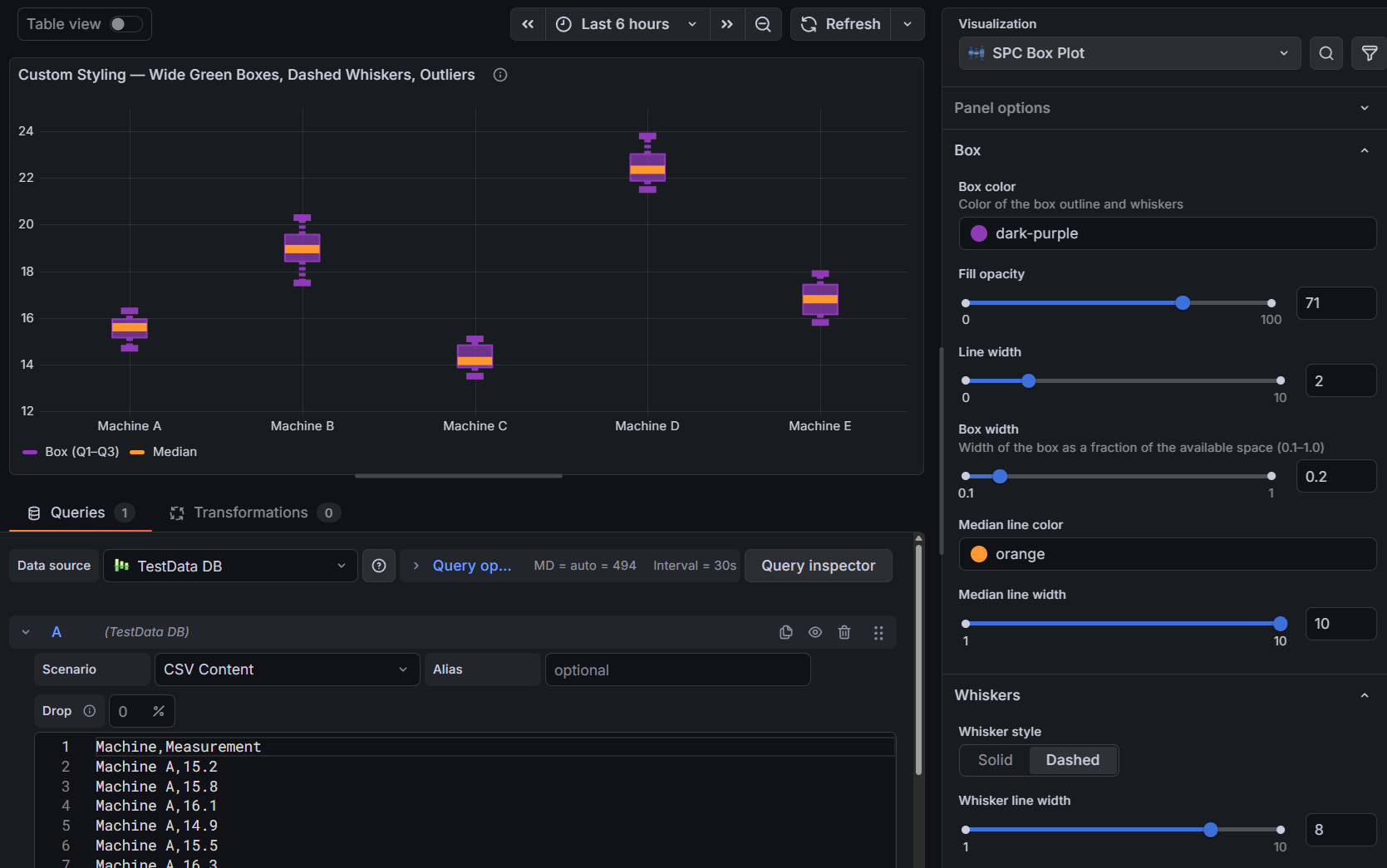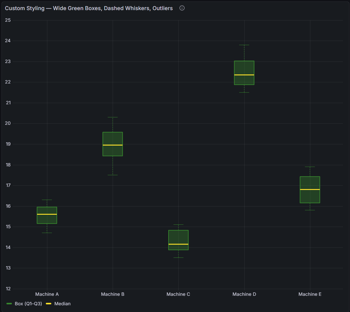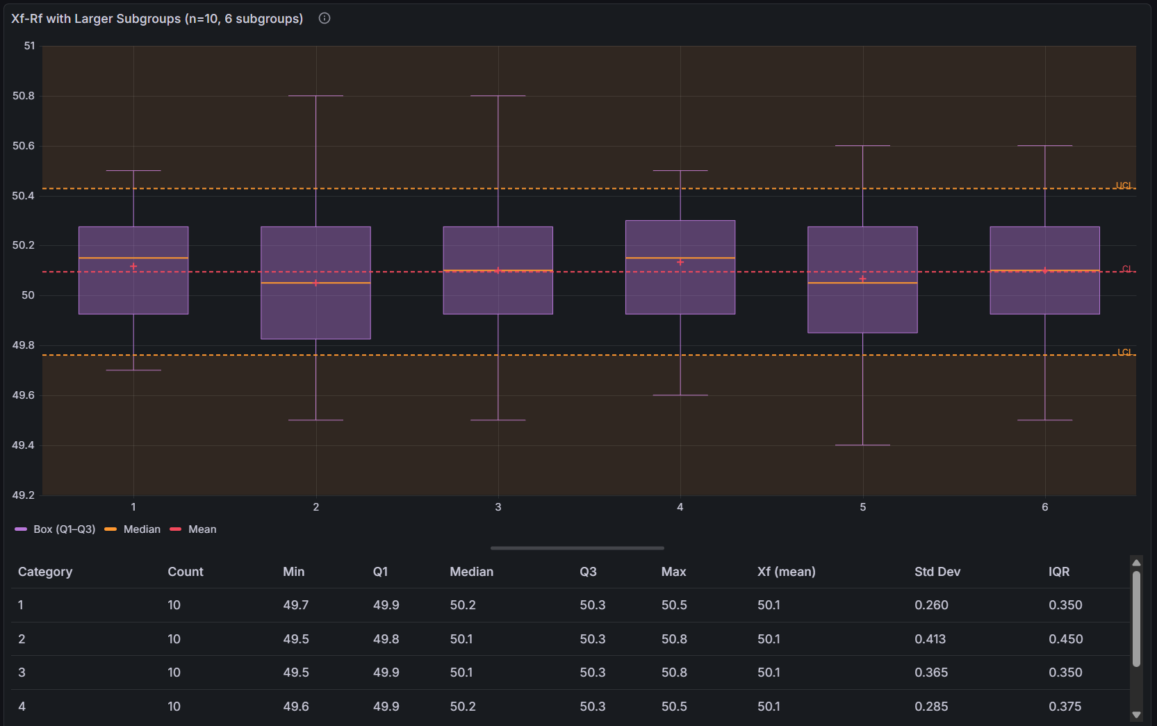 Visualize process data distributions as box plots with built-in Statistical Process Control — right inside Grafana. SPC Box Plot groups your measurements into subgroups, draws standard box-and-whisker plots, and overlays robust Xf-Rf control limits so you can detect shifts in process spread and location at a glance.