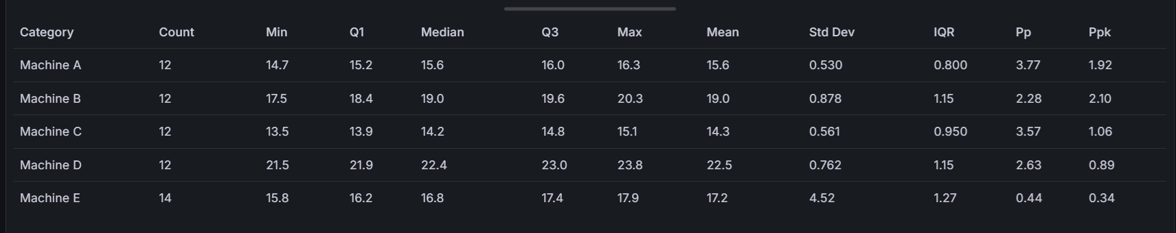 | Statistics table | n, Mean, Std Dev, Min, Max, Q1, Median, Q3, IQR, Cp, Cpk, Pp, Ppk |