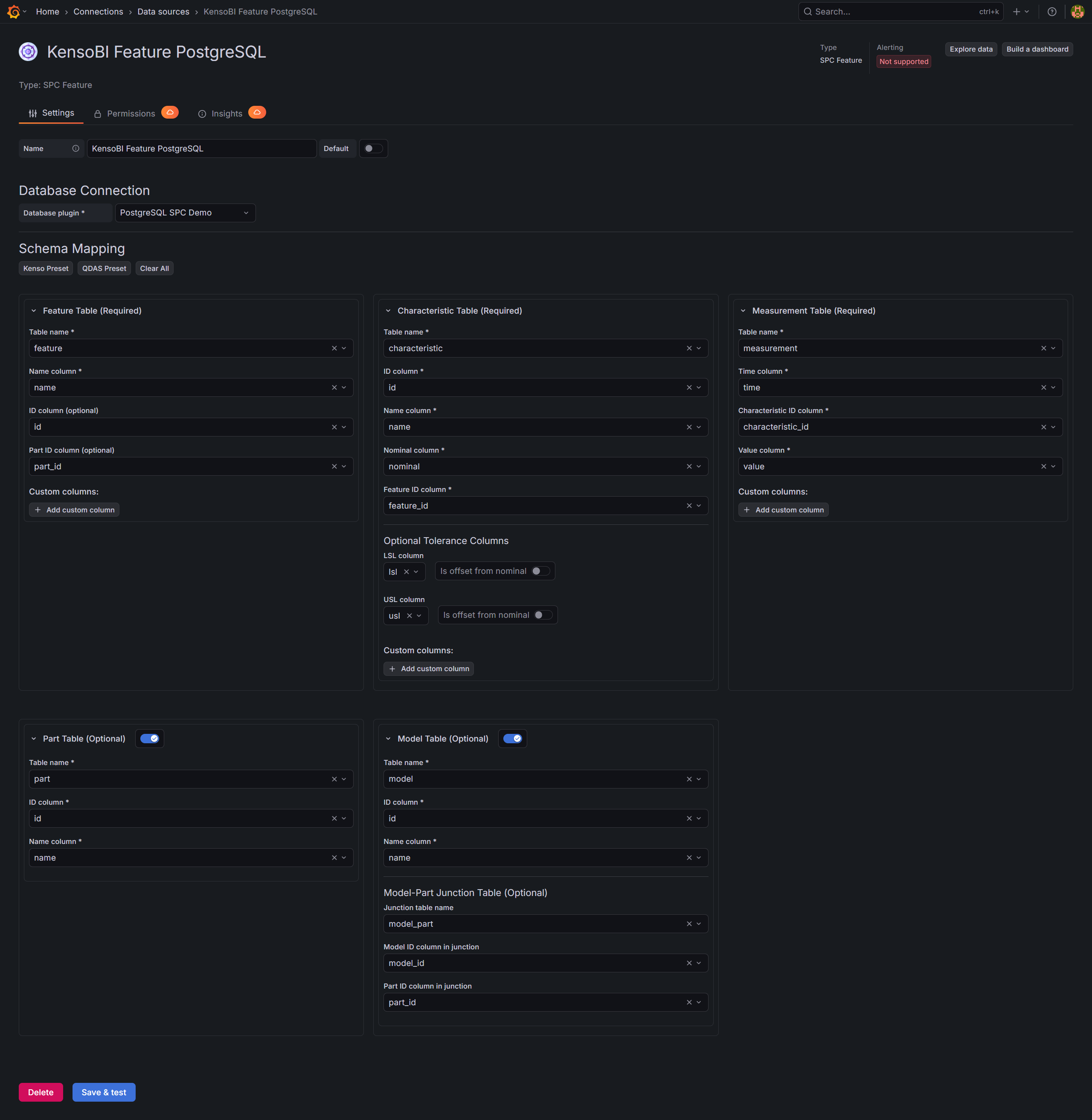 - Click Kenso Preset or QDAS Preset to auto-fill the schema, or configure table and column mappings manually.