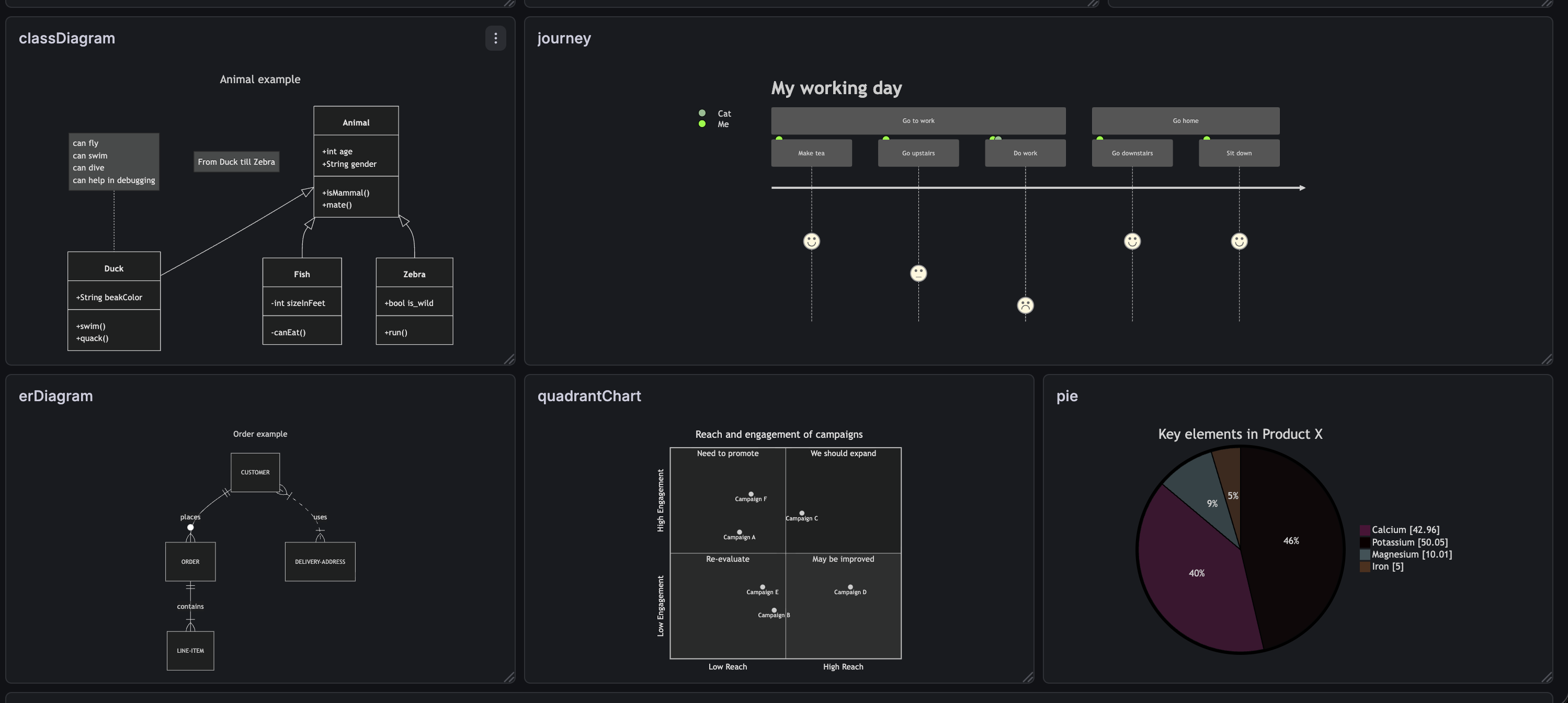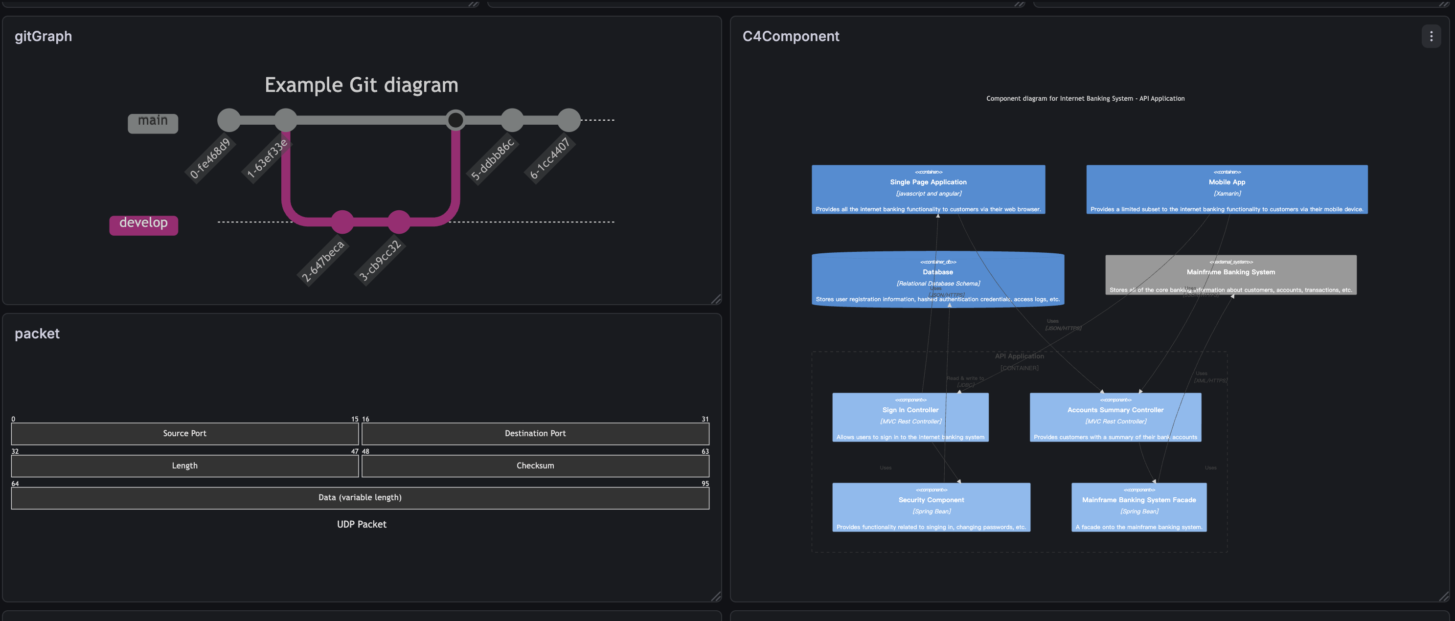 - All Mermaid diagram types — Flowchart, Sequence, Class, State, ER, Gantt, Pie, Mindmap, Timeline, Git Graph, C4, and more