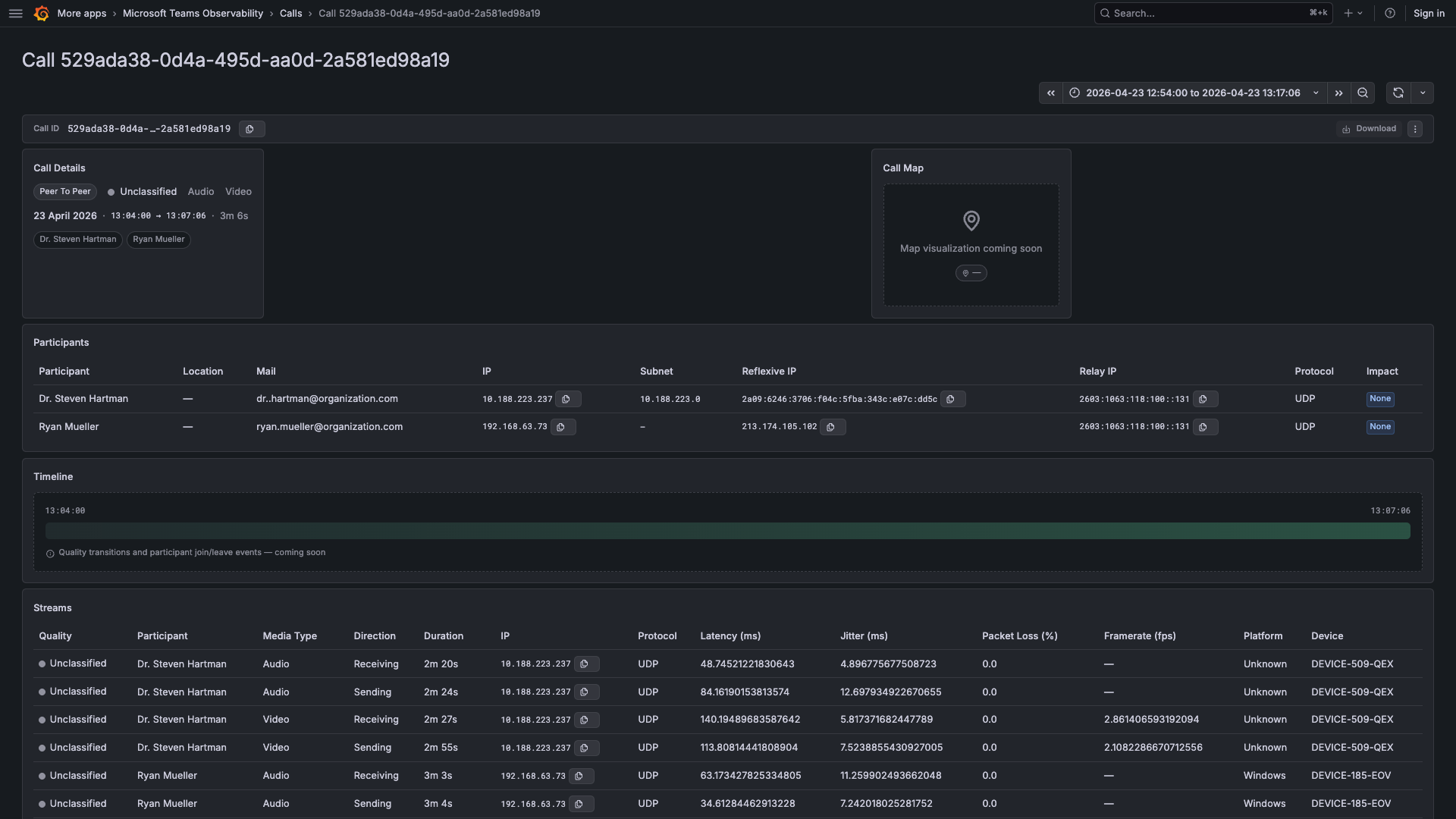 Detailed analysis of a single Microsoft Teams call, including participants, locations, quality indicators, stream-level metrics, timeline data, and optional AI-generated root cause analysis.