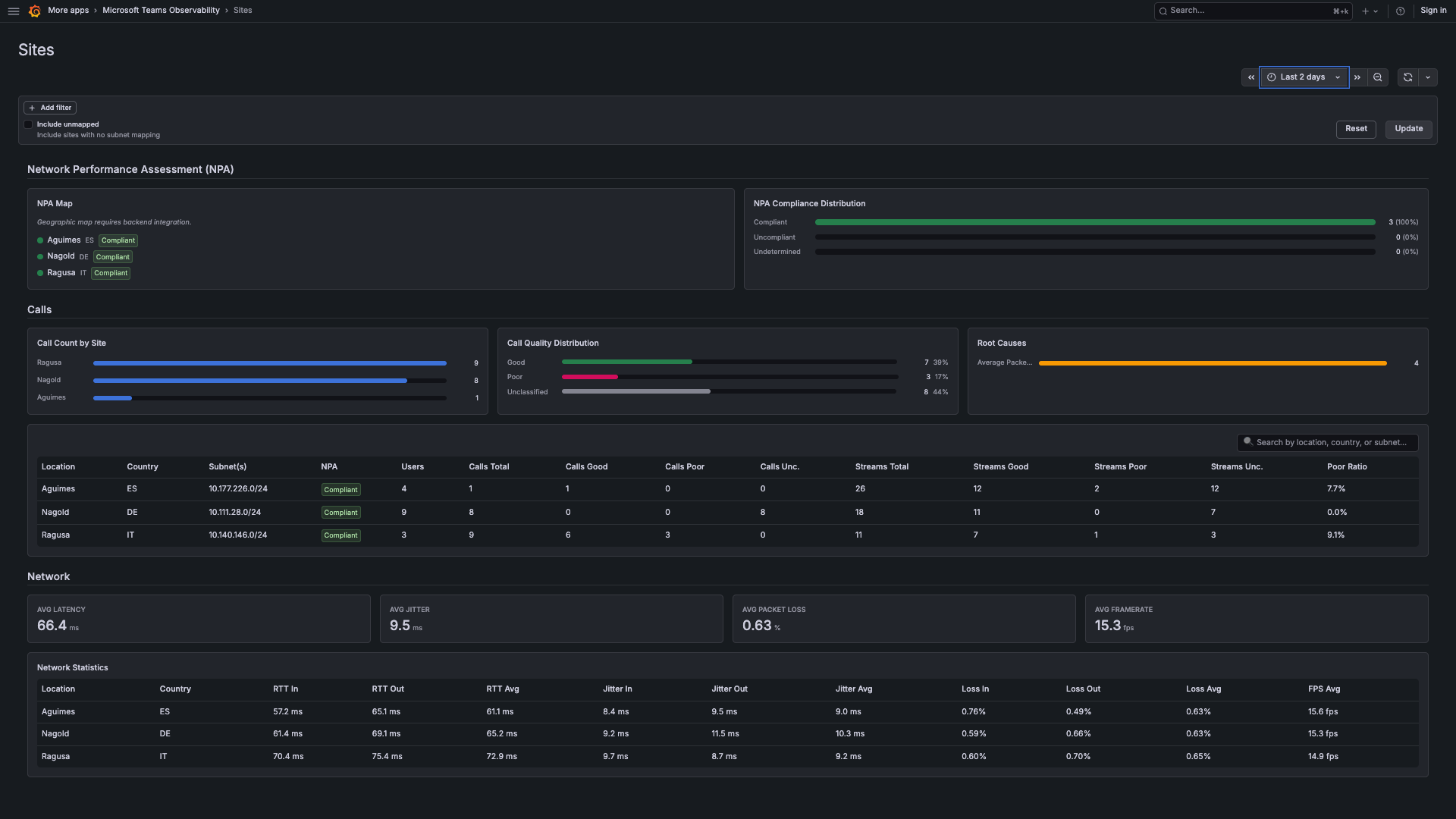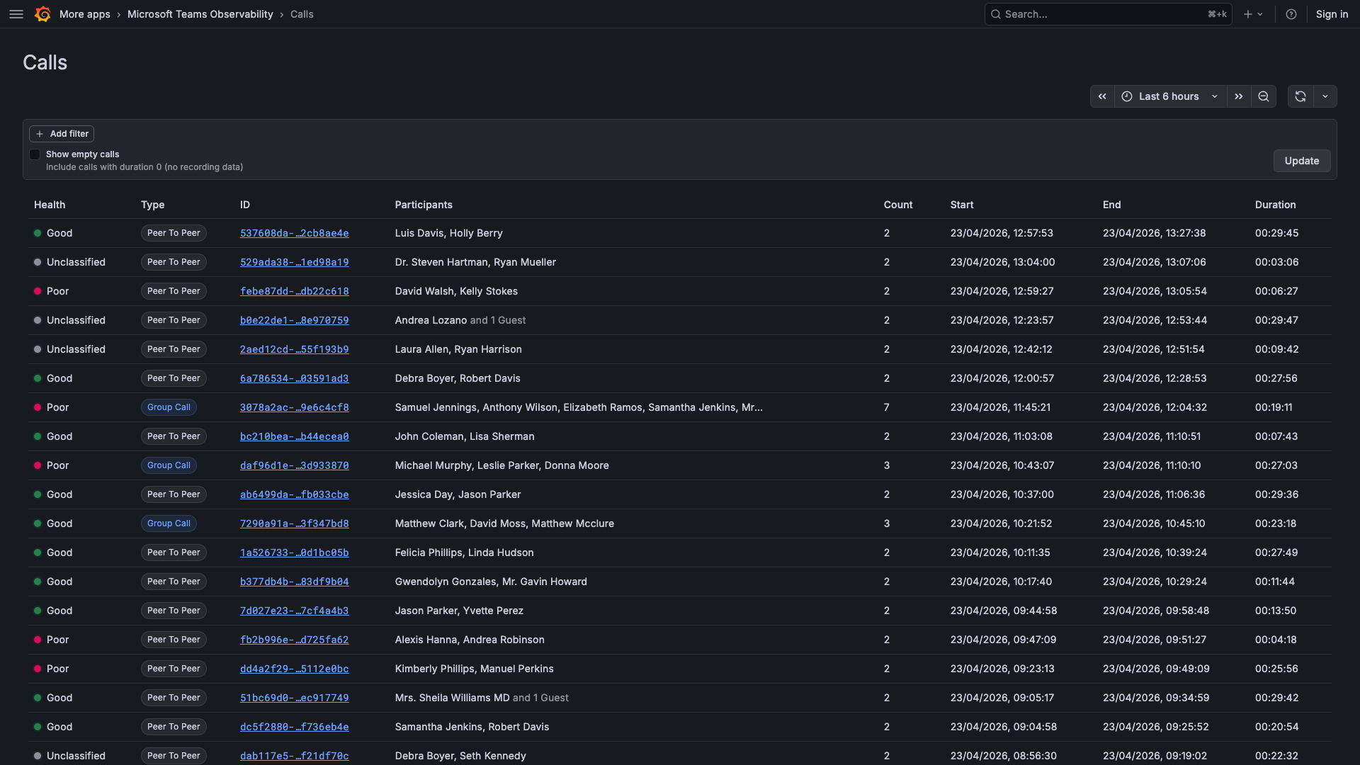 Installed in a Grafana environment, the application provides operational visibility into Microsoft Teams activity and quality using telemetry collected by the agent and stored in a Loki datasource. It helps organizations monitor collaboration experience, investigate service degradations, analyze call quality, and support operational troubleshooting workflows across engineering, operations, and support teams.