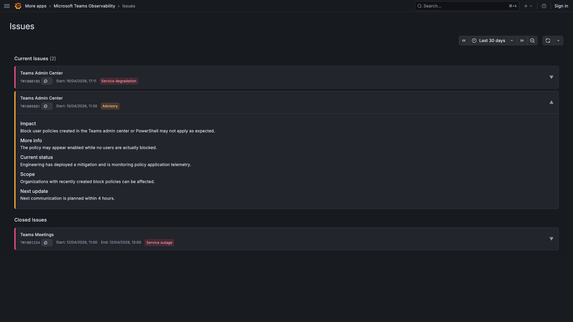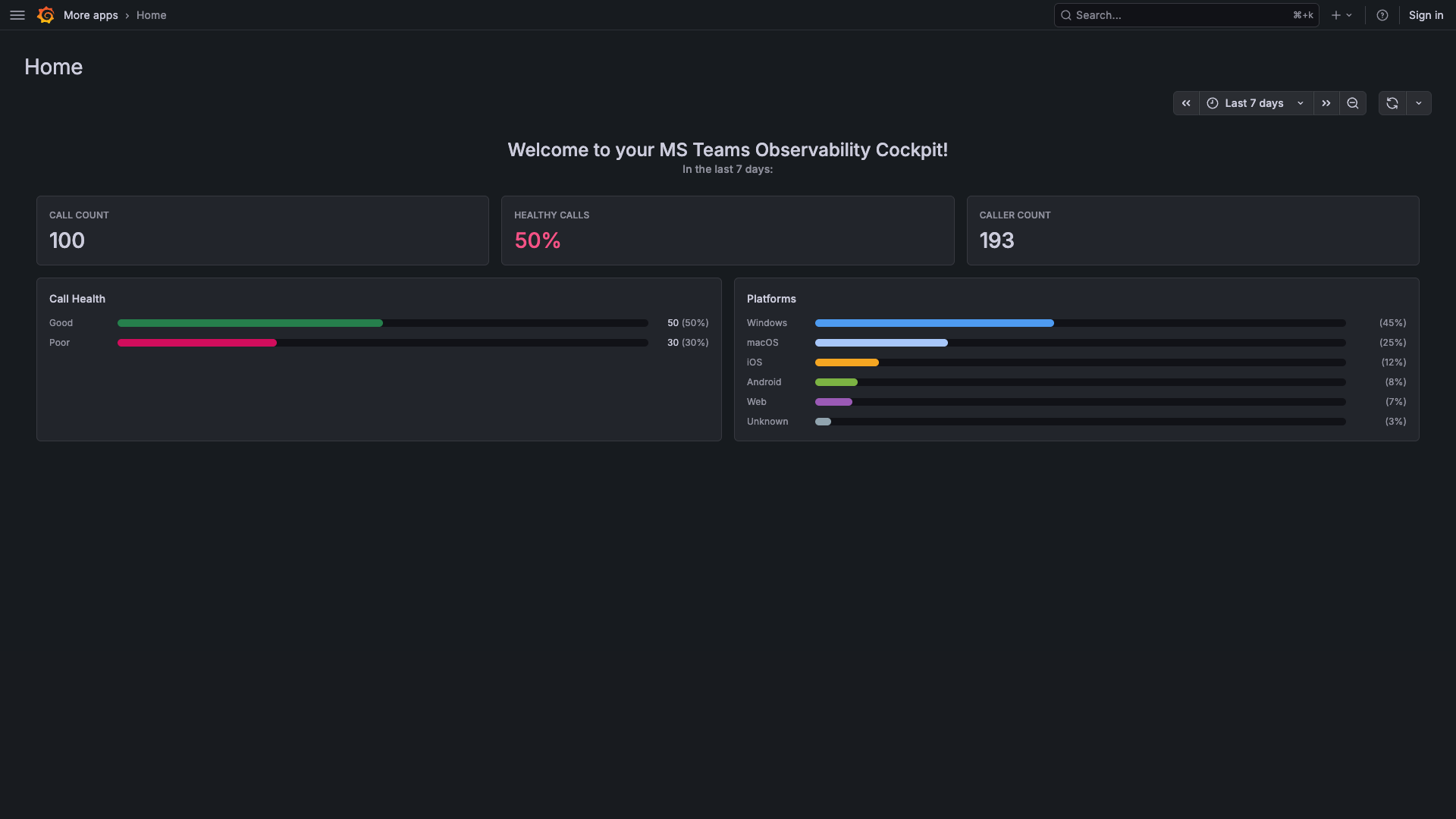 The MS Teams Observability Grafana Application provides ready-to-use visualizations to monitor Microsoft Teams inside Grafana.