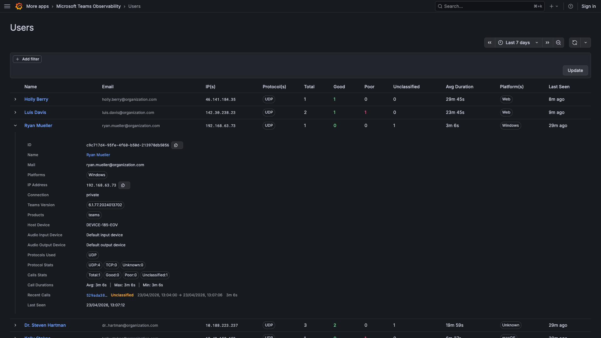 Per-user analytics across the Microsoft Teams environment, including identity, call statistics, network information, device details, and recent activity.