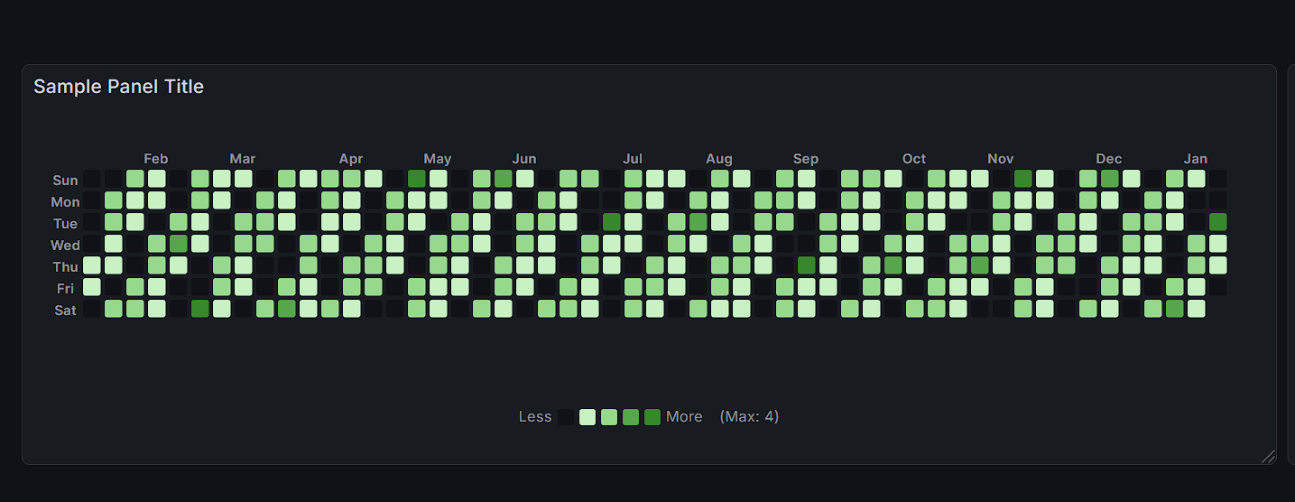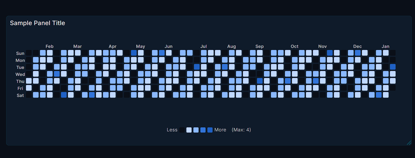 Turn raw time-series data into an instantly readable, GitHub-style activity calendar. Calendar Heatmap Panel makes trends, spikes, and gaps obvious at a glance—perfect for dashboards built for action.