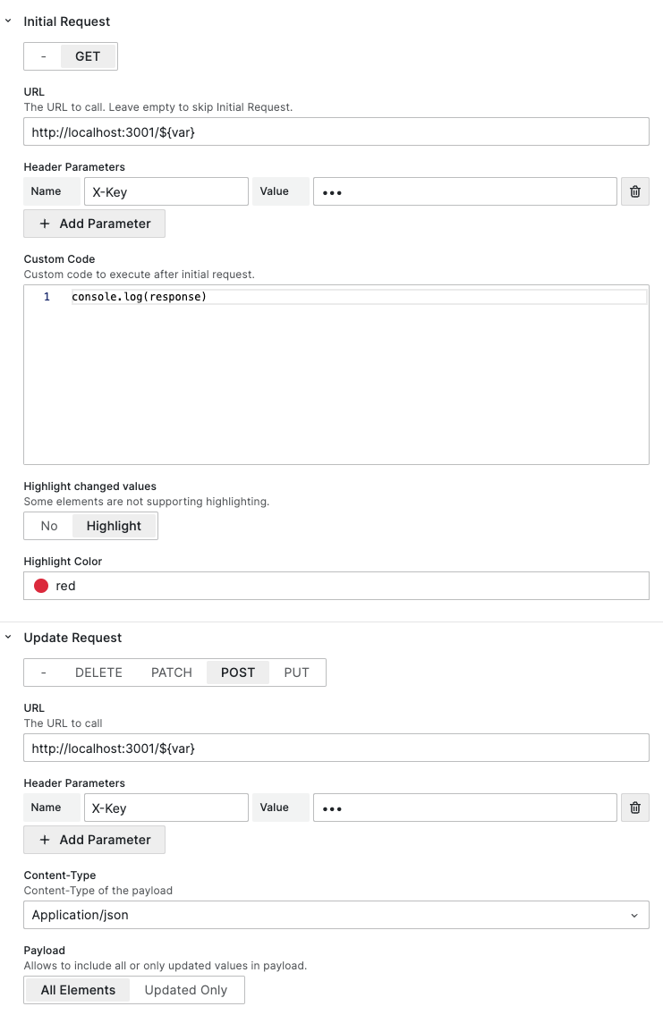GET,DELETE,PATCH,POST, andPUTrequests for data manipulation. - Request Headers: Add custom headers to initial and update requests.