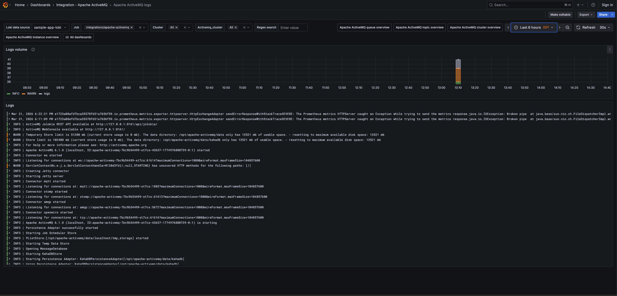 Easily monitor your deployment of Apache ActiveMQ, an open source message broker software that facilitates communication between different applications or components using messaging patterns, with Grafana Cloud’s out-of-the-box monitoring solution. The Grafana Cloud forever-free tier includes 3 users and up to 10k metrics series to support your monitoring needs.