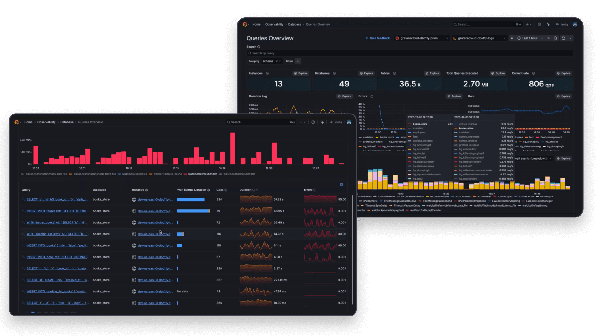 リソースモニタリングを超えて、説明プラン、待機イベント、および個々のクエリサンプルを視覚化します。集約パターンからスローダウンを引き起こした特定の実行に移行します。