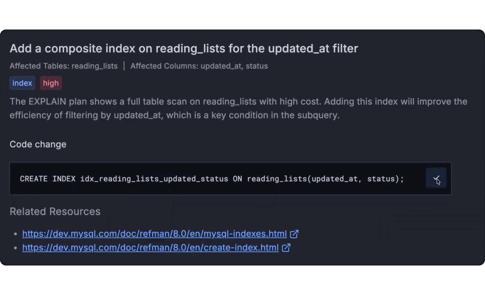 AIが提案するCREATE INDEX文とクエリの書き換えでクエリのボトルネックを解決します。コピー、テスト、改善を迅速に出荷します。