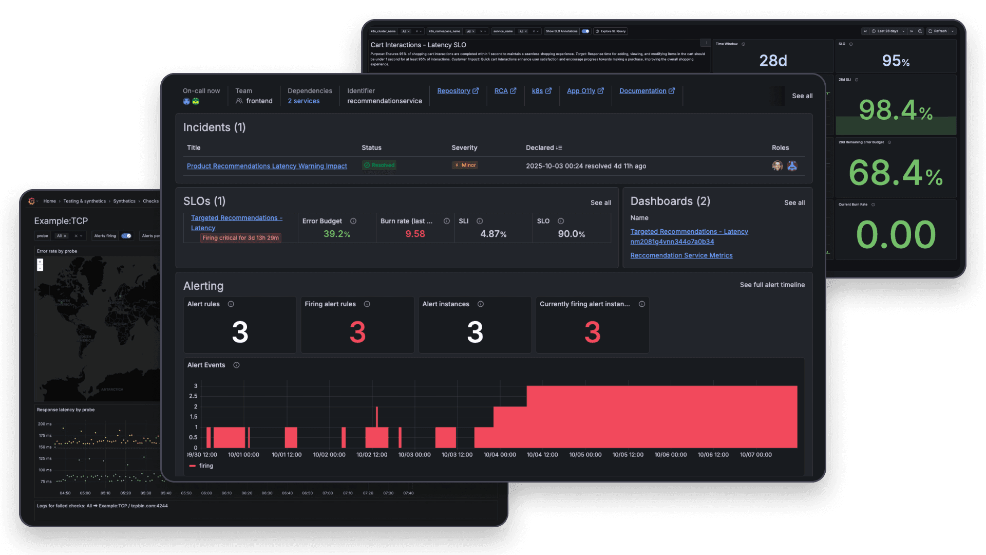 Grafana Cloud helps SRE and platform teams build reliable, high-performing systems by combining performance testing, synthetic monitoring, application observability, SLOs, and incident response in one platform.