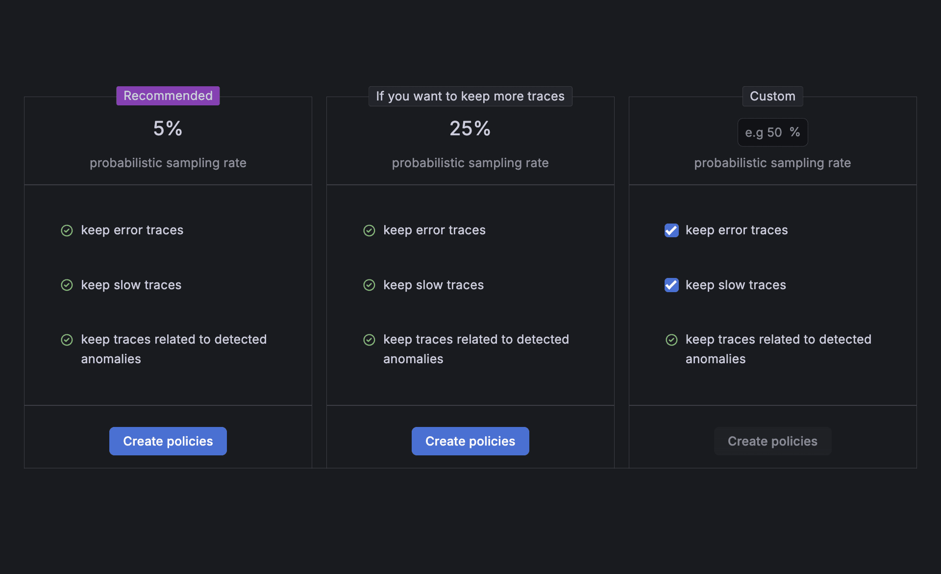 • Adaptive Traces: Uses a tail sampling approach to retain and surface only your most valuable traces
