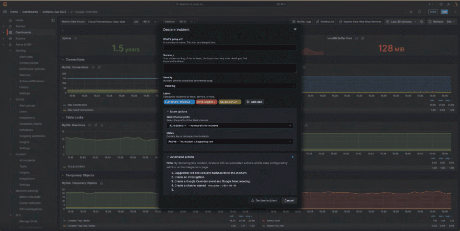 Go from monitoring to active incident response within the Grafana ecosystem, and create incident channels and collaboration spaces directly from your visualizations.