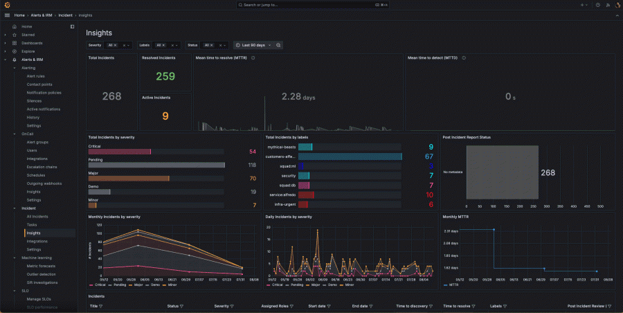 Track key metrics, such as mean time to resolution (MTTR) and mean time to detection (MTTD), identify bottlenecks, and analyze performance by various dimensions, including label, severity, or status.
