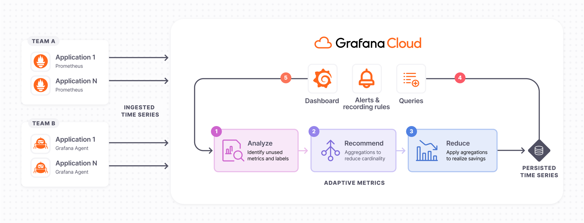 Eliminate unused metrics via custom cardinality optimizations that adapt to your cloud native environment with the Adaptive Metrics feature. Reduce metric cardinality and costs – all within the fully managed Grafana Cloud platform.