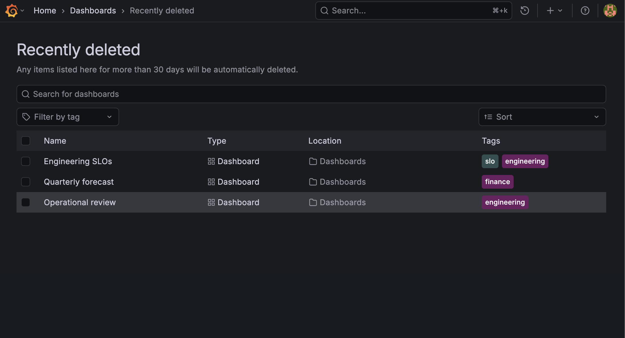 Start using dashboard restore today from your dashboards view in Grafana.