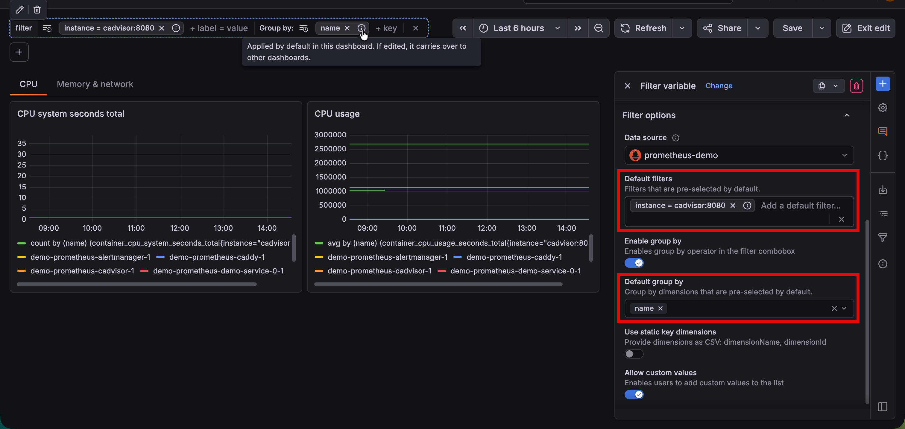 Dashboard authors can now set default filters and group-by dimensions that viewers land on when opening a dashboard. This is especially valuable for teams with agreed-upon starting points—for example, always filtering to production and grouping by region—so every viewer begins their investigation from a meaningful baseline rather than a blank slate. Users can edit these values to further their search and can easily restore to the initial default setup.