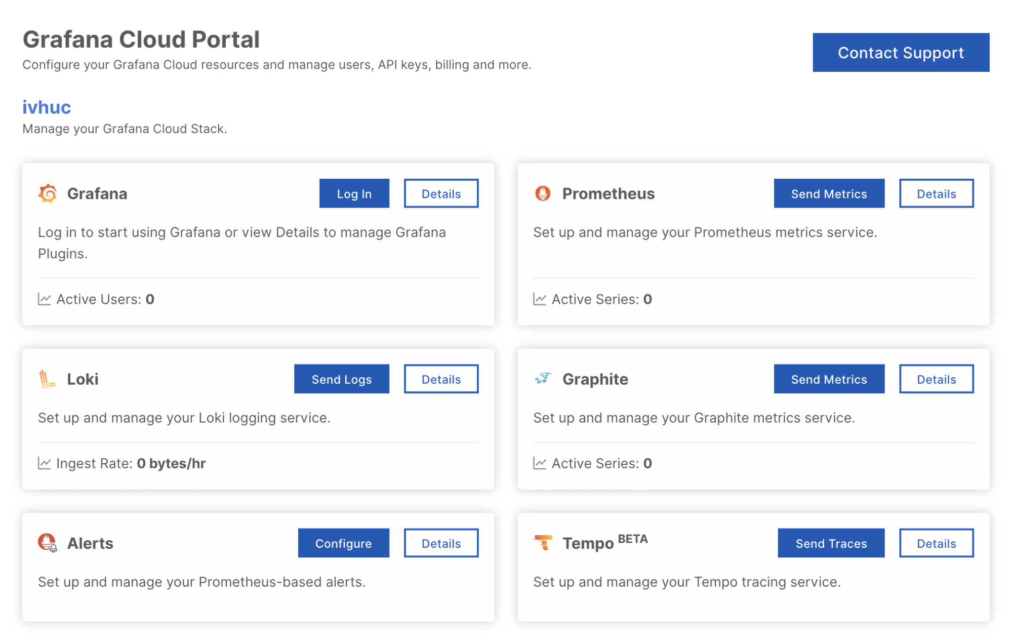 I went to the Grafana Cloud signup and created a new account. As soon as I had my account all set up, I could see my portal with my hosted Grafana, Loki, and Graphite instances.