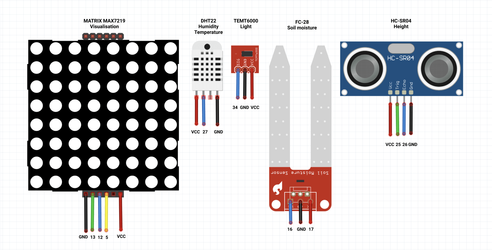 - 1 LED display MATRIX MAX7219 to show current conditions of the plant directly on the monitoring system