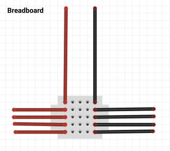 As I had more inputs and outputs than power and ground pins, I also used the 25 points breadboard. I wired it to the vcc pin and gnd pin, so I created 3 extra gnd and vcc pins that I will use for my inputs and outputs.