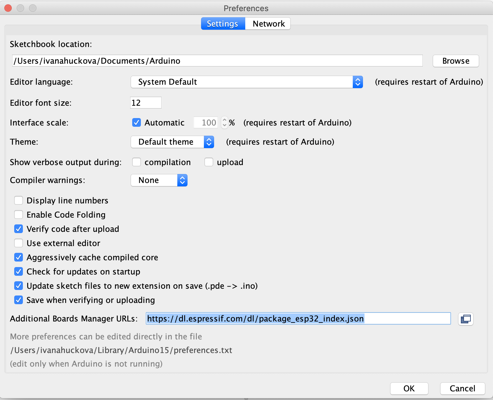 After my ESP32 board is connected to my computer, I continue with opening my Arduino IDE. As I am using an ESP32 board (and not an Arduino board), I need to add a board definition that adds support for my EP32 board. In Arduino > Preferences, I have added the url https://dl.espressif.com/dl/package_esp32_index.json to the Additional Boards Manager URLs input. This open source board definition adds support for programming ESP32 boards.