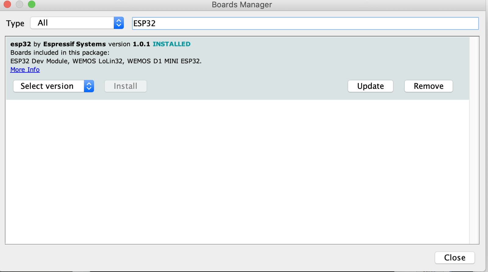 Then, in Tools > Boards > Boards Manager I have added ESP32 board manager.