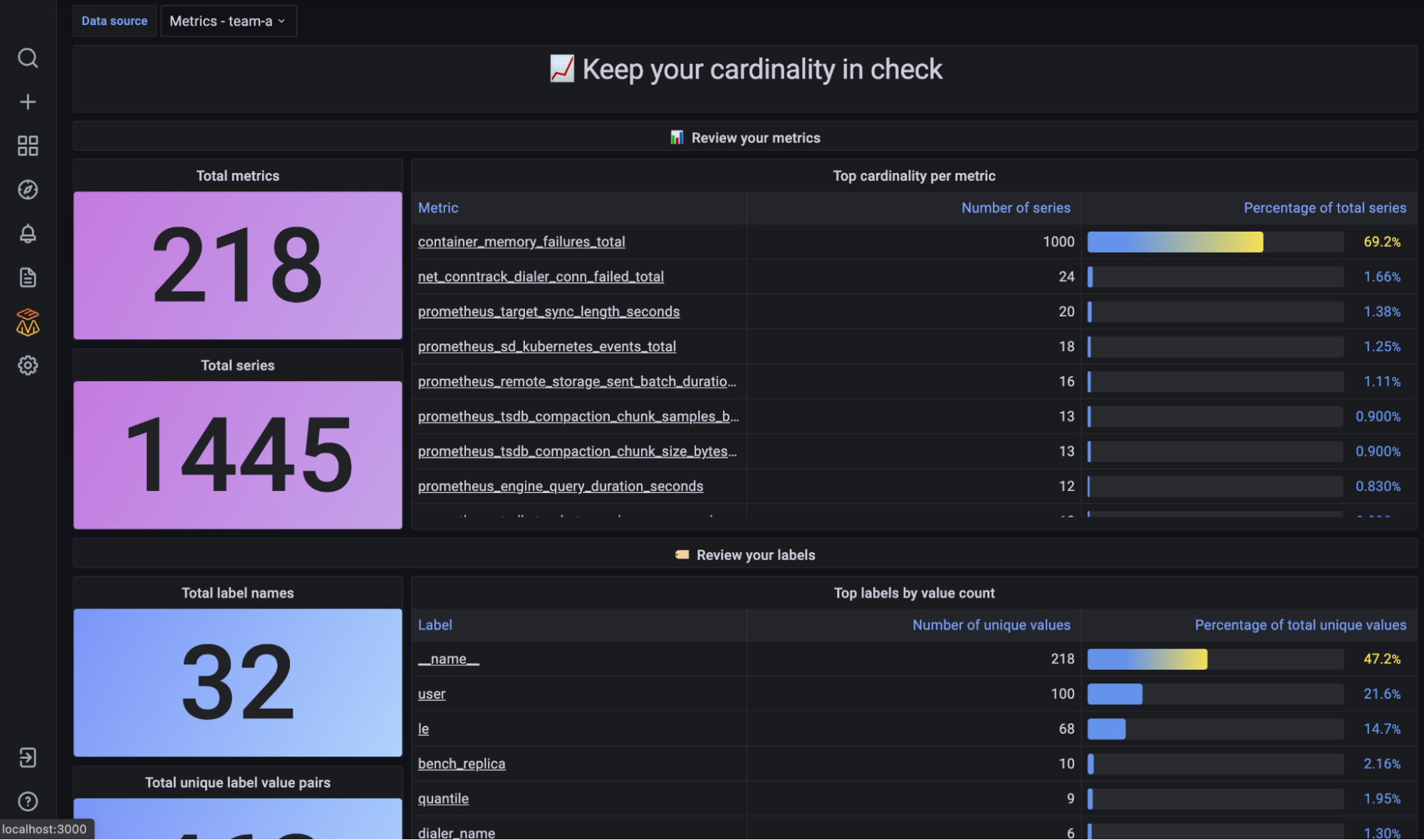 One of the pains we hear over and over again from customers is the challenge of reasoning about the cost, cardinality, and usefulness of the data they’re sending into their observability systems. Which is why we built our new cardinality analysis tool, which tackles this problem by enabling users to quickly drill into their Prometheus metrics data with pre-built dashboards that help answer questions like: