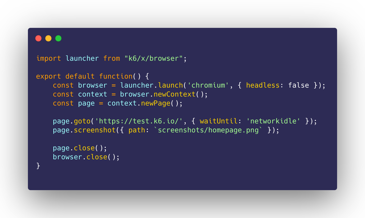 With xk6-browser, you can interact with the browser to test your web applications end-to-end while accessing all of the k6 core features, including protocol-level APIs and other k6 extensions. A single tool for both protocol and browser-level testing.