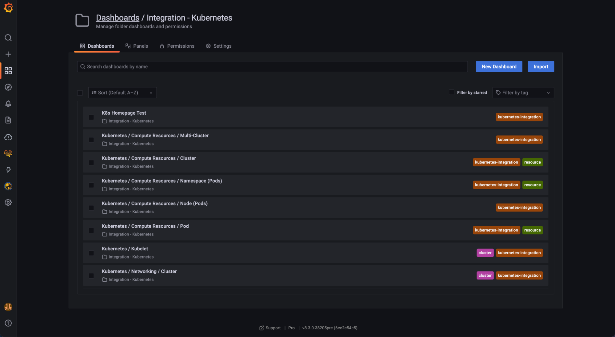 The Kubernetes integration is packaged with pre-built dashboards and alerts — including six dashboards from the original Kubernetes mixin. After configuring the Kubernetes integration, you’ll be guided directly to content that is relevant to you.