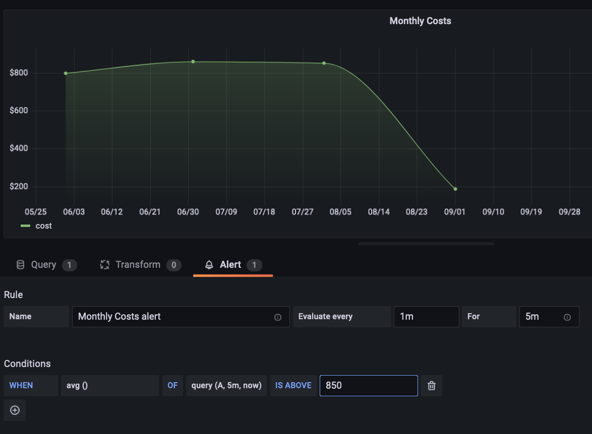 We also have an example of an annotations set up in a sample dashboard with a “Budget exceeded” tab. When we turn it on, we can see a dotted line appear on our graph every time our monthly costs exceed our budget of $850.