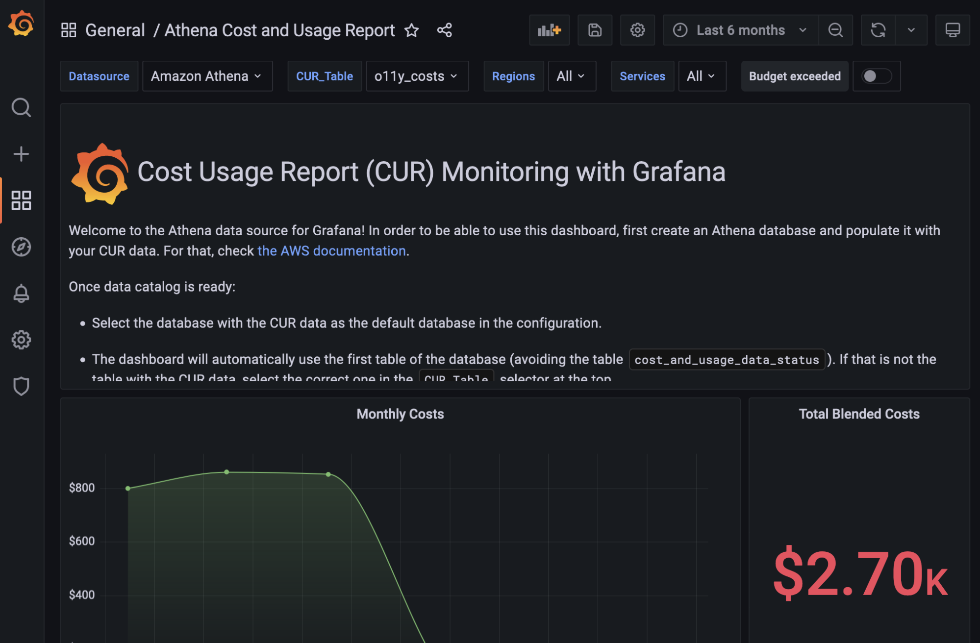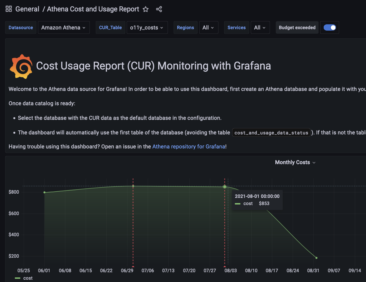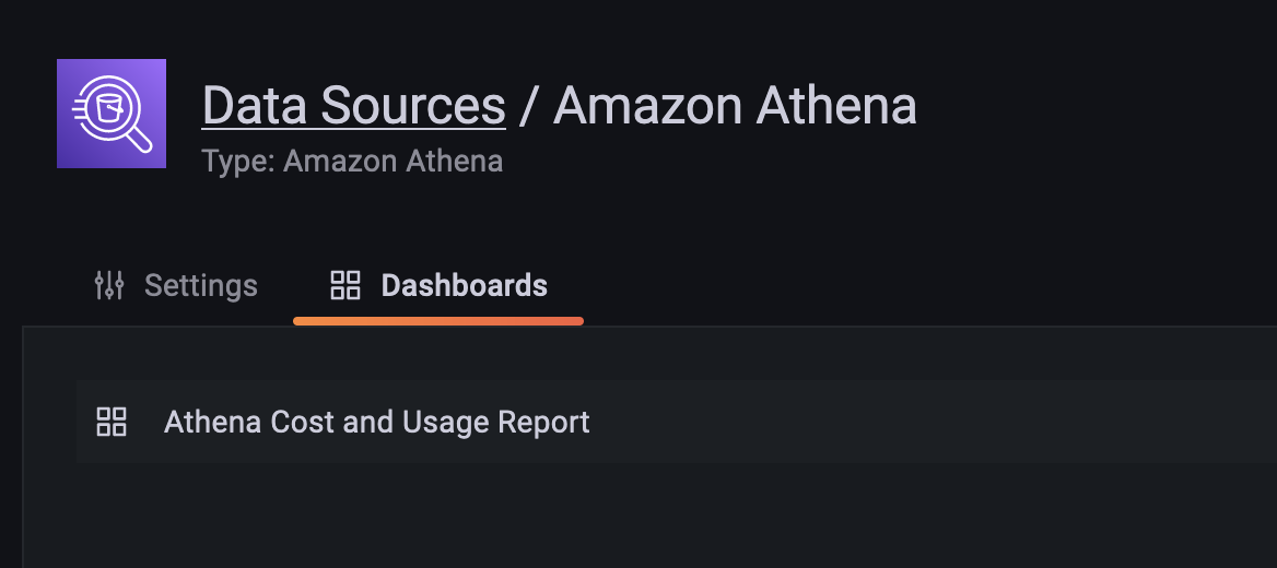 When you install the Athena data source plugin for Grafana, you’ll see in the Dashboards tab on the configuration page that this plugin comes with a curated dashboard that is set up to read AWS Cost Usage Reports (CUR) data.