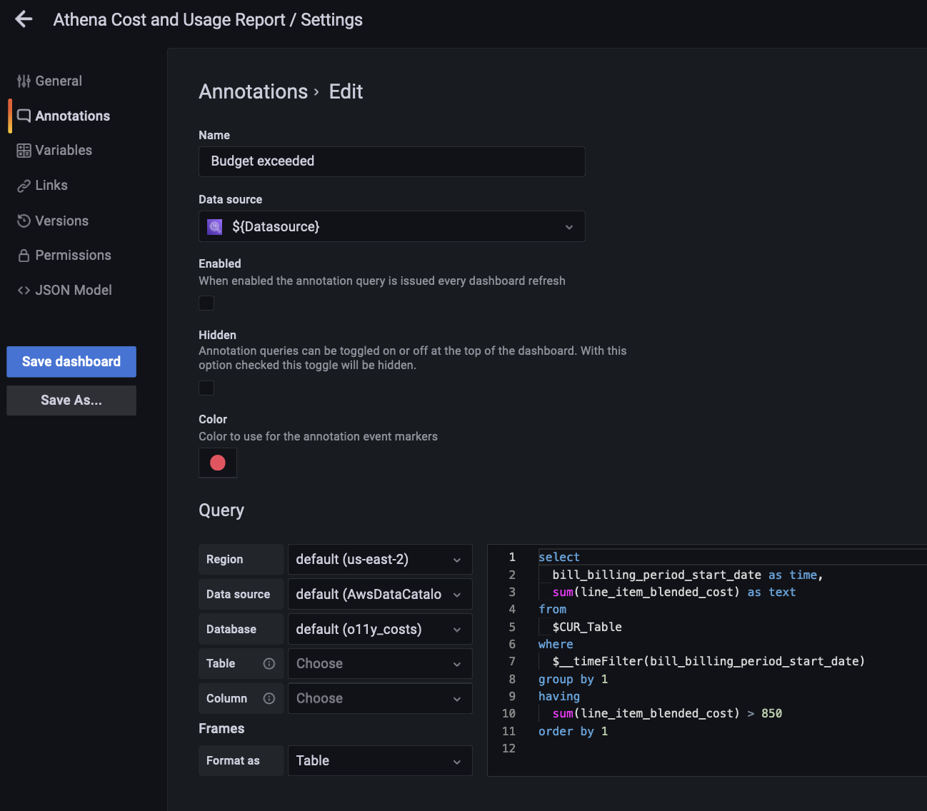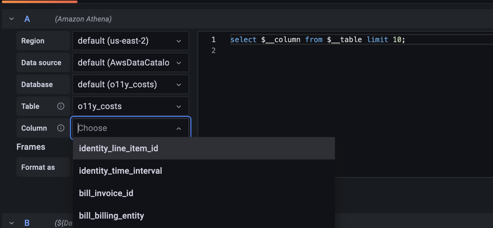 When we edit a panel from our CUR dashboard, we see the query editor for the plugin comes with SQL syntax highlighting and allows us to make queries per region, per data source, and per database, or use default selections as set on the plugin’s configuration page.